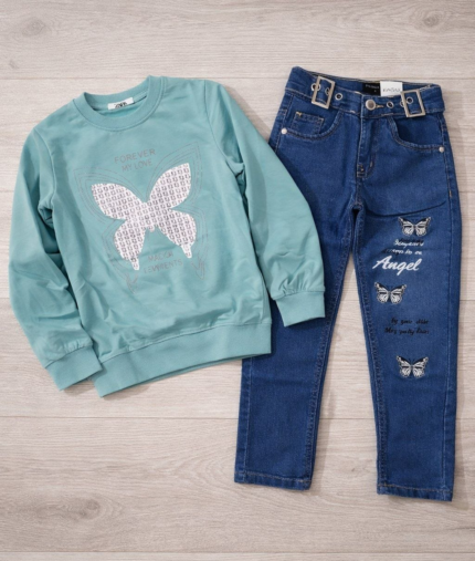 Ensemble fille sweat & jean motif papillon – 2 couleurs