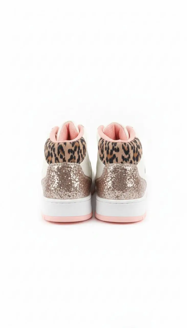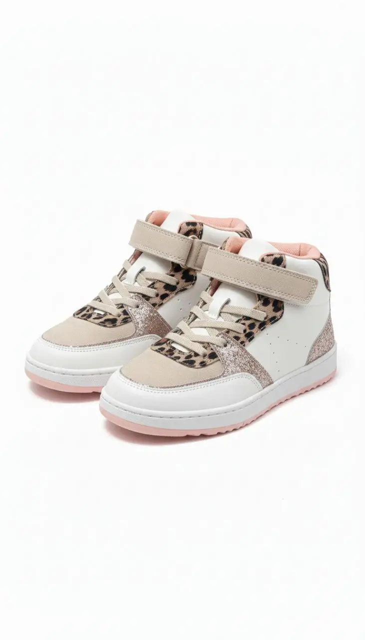 Baskets montantes pour fille au design élégant, en coloris beige et blanc avec détails pailletés et imprimé léopard. Fermeture à scratch et lacets pour un bon maintien, semelle confortable et antidérapante, idéales pour l’école et les sorties avec un style tendance et chic.