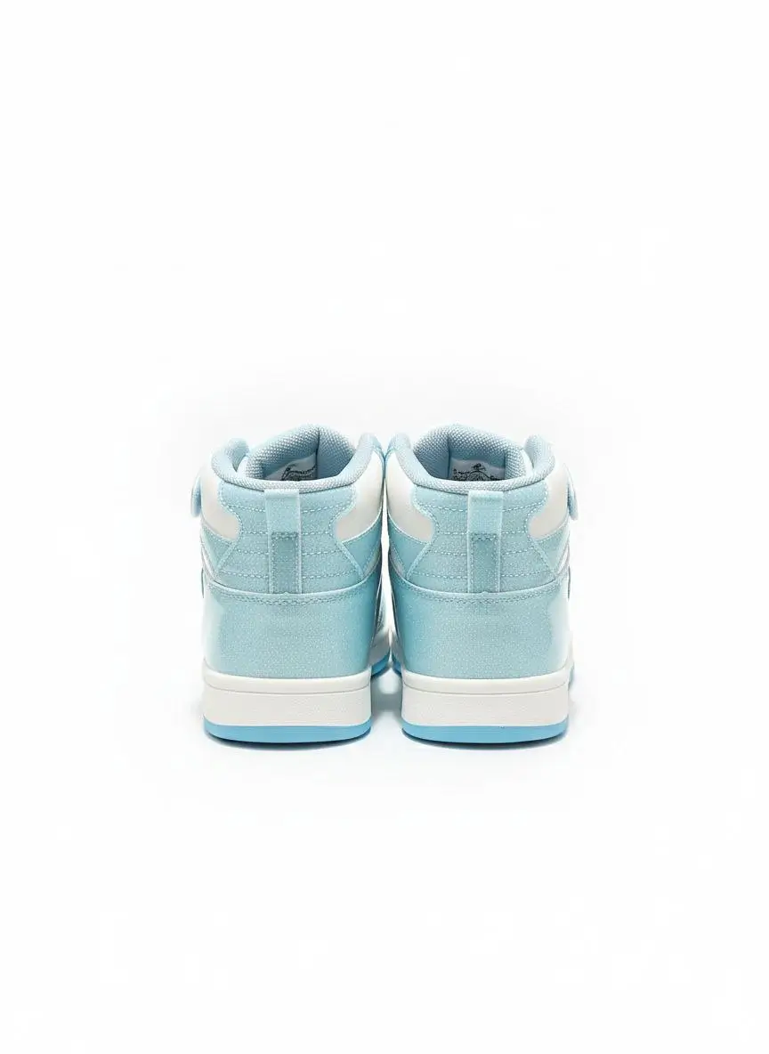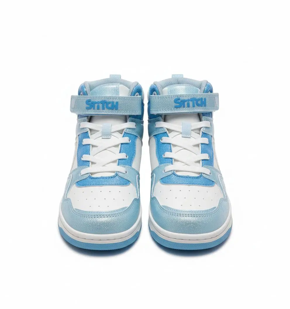 Baskets montantes pour fille au design pailleté bleu clair avec motif Stitch. Fermeture à scratch et lacets pour un maintien sécurisé, semelle confortable et antidérapante, idéales pour l’école et les sorties quotidiennes avec un style fun et tendance.