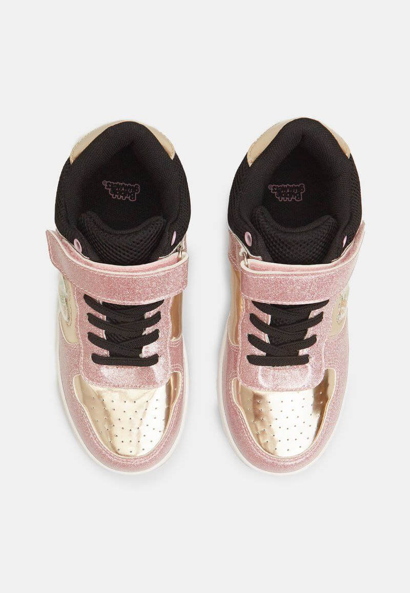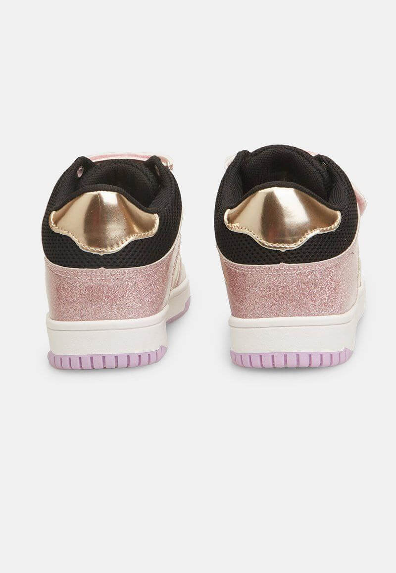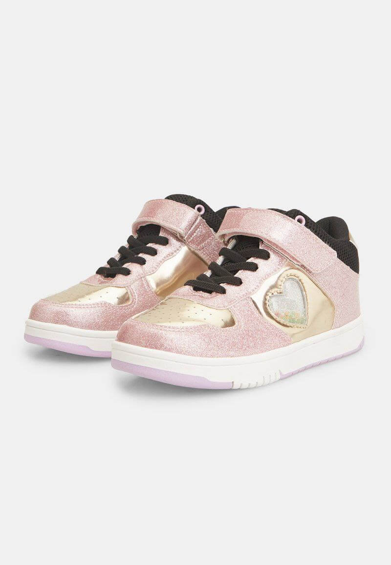 Baskets fille à scratch rose pailleté avec cœur. Confortables, stylées et pratiques, idéales pour l’école et les loisirs.