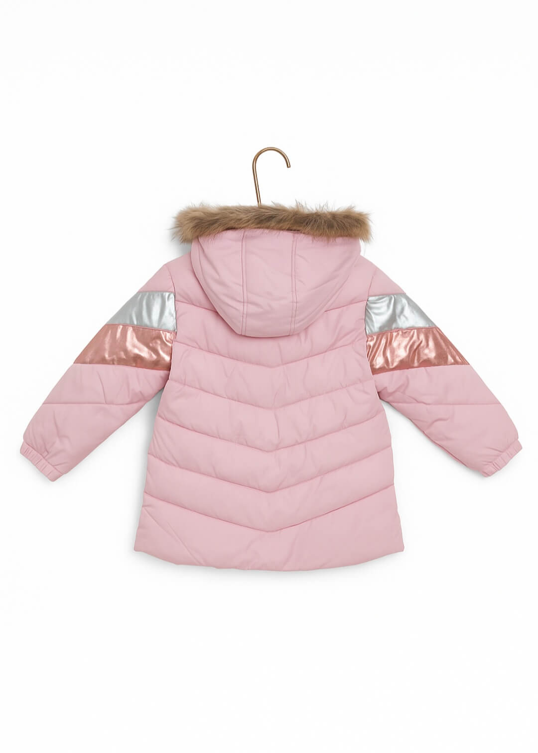Découvrez la doudoune fille hiver rose, chaude, confortable et tendance, idéale pour affronter le froid. Avec capuche en fourrure et bandes métallisées élégantes. Disponible du 6 au 14 ans.