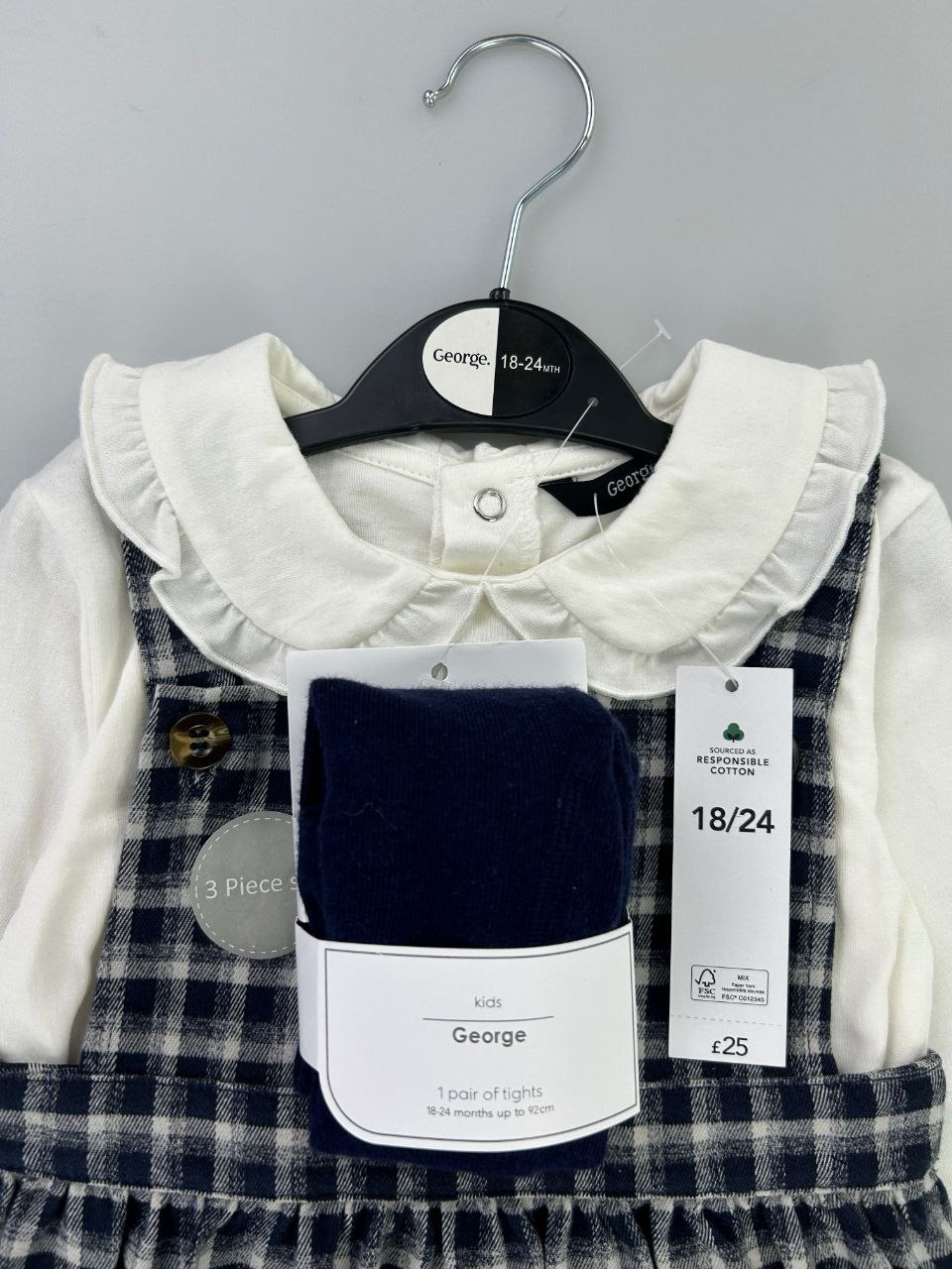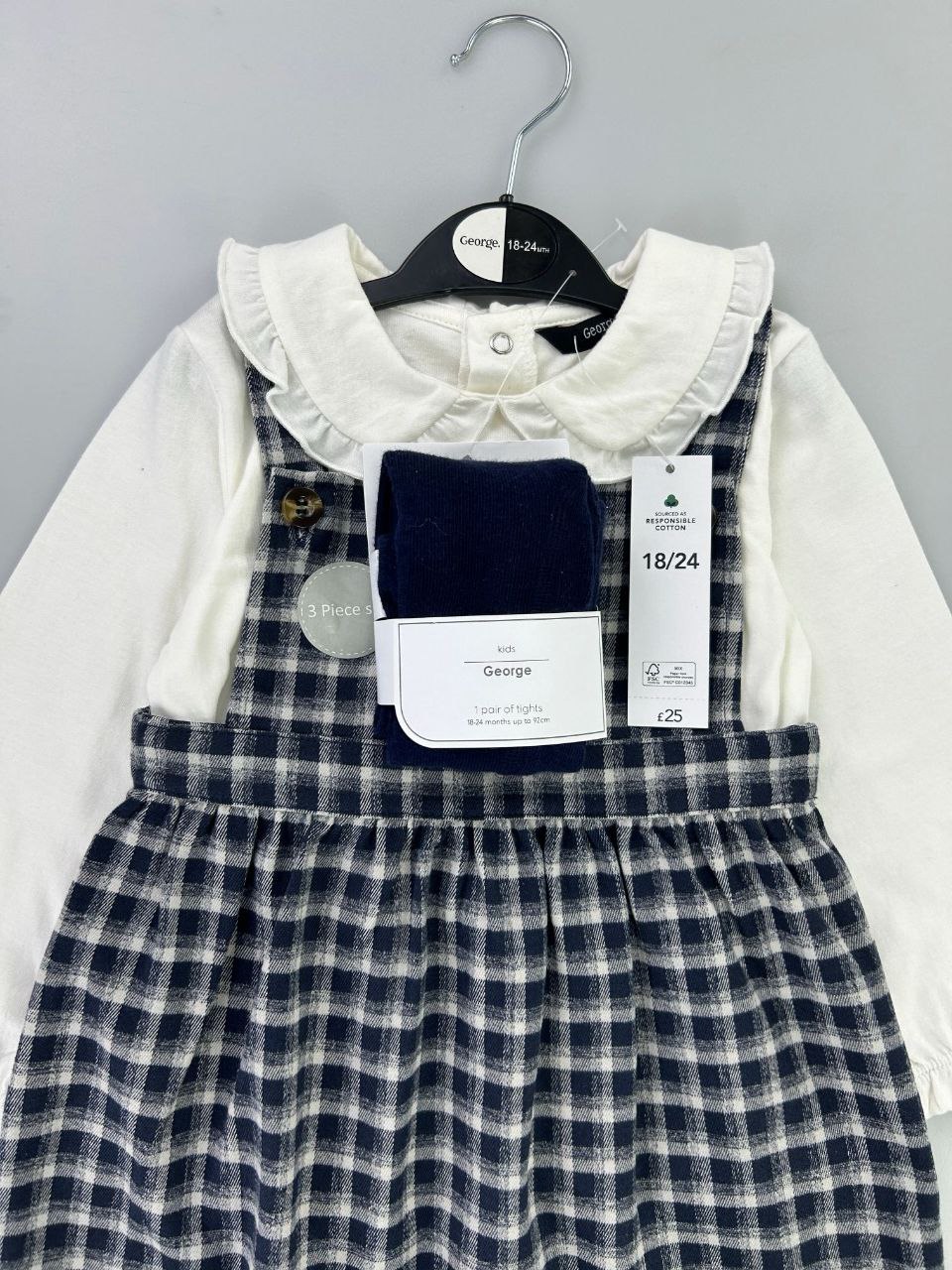 Ensemble élégant pour bébé fille composé de 3 pièces : salopette à carreaux, pull doux à col volanté et les bas assortis inclus. Confortable et chic, idéal pour le quotidien comme pour les sorties. Disponible de 3 mois à 3 ans.