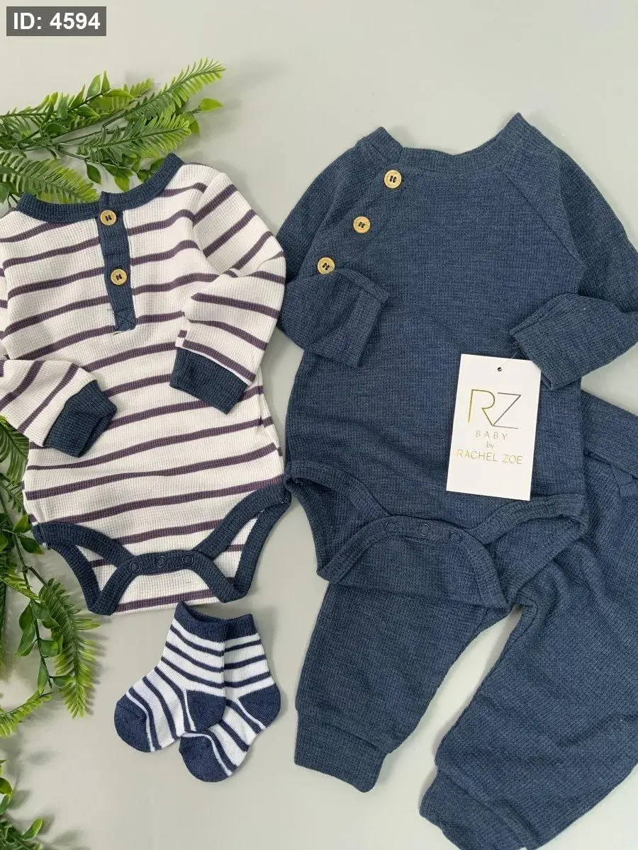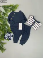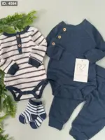 Ensemble bébé garçon composé de deux bodies à manches longues, d’un pantalon assorti et d’une paire de chaussettes, idéal pour le confort quotidien des tout-petits. Matière douce et agréable pour la peau sensible, avec boutons pratiques pour un habillage facile. Style sobre et élégant, parfait pour les journées fraîches. Disponible pour les bébés de 0 à 9 mois.