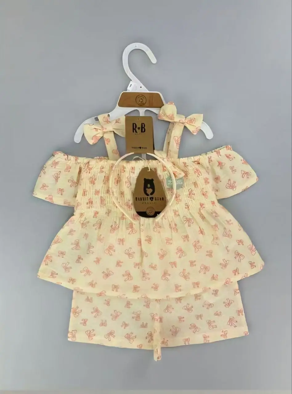 Ensemble estival pour fille composé d’une robe légère sans manches avec motifs et short . Disponible en quatre couleurs élégantes, idéal pour les enfants de 1 à 4 ans. Confortable, respirant et parfait pour les journées chaudes.