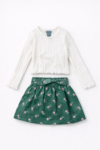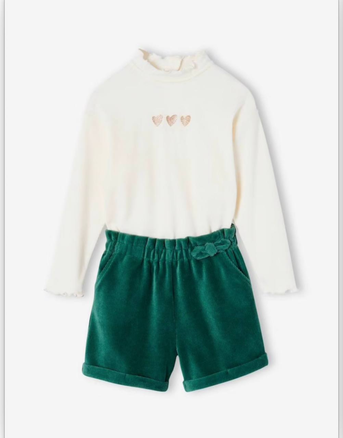 Ensemble fille composé d’un haut blanc à manches longues avec détails délicats et d’un short vert à taille élastique avec nœud décoratif. Tenue confortable et élégante, idéale pour un look chic au quotidien.