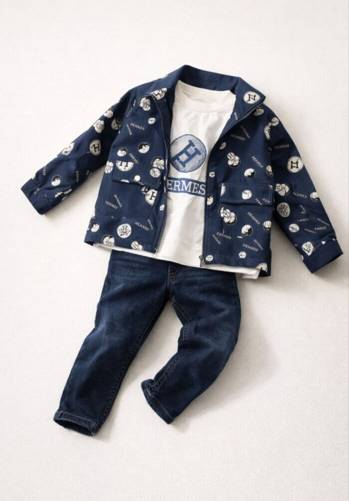 Ensemble garçon Hermès élégant et moderne, composé d’une veste imprimée, d’un t-shirt et d’un jean confortable. Disponible en deux modèles raffinés : veste marron avec jean noir ou veste bleu marine avec jean bleu. Un look premium, pratique et tendance pour garçons de 6 à 12 ans.