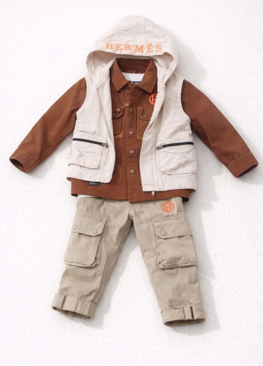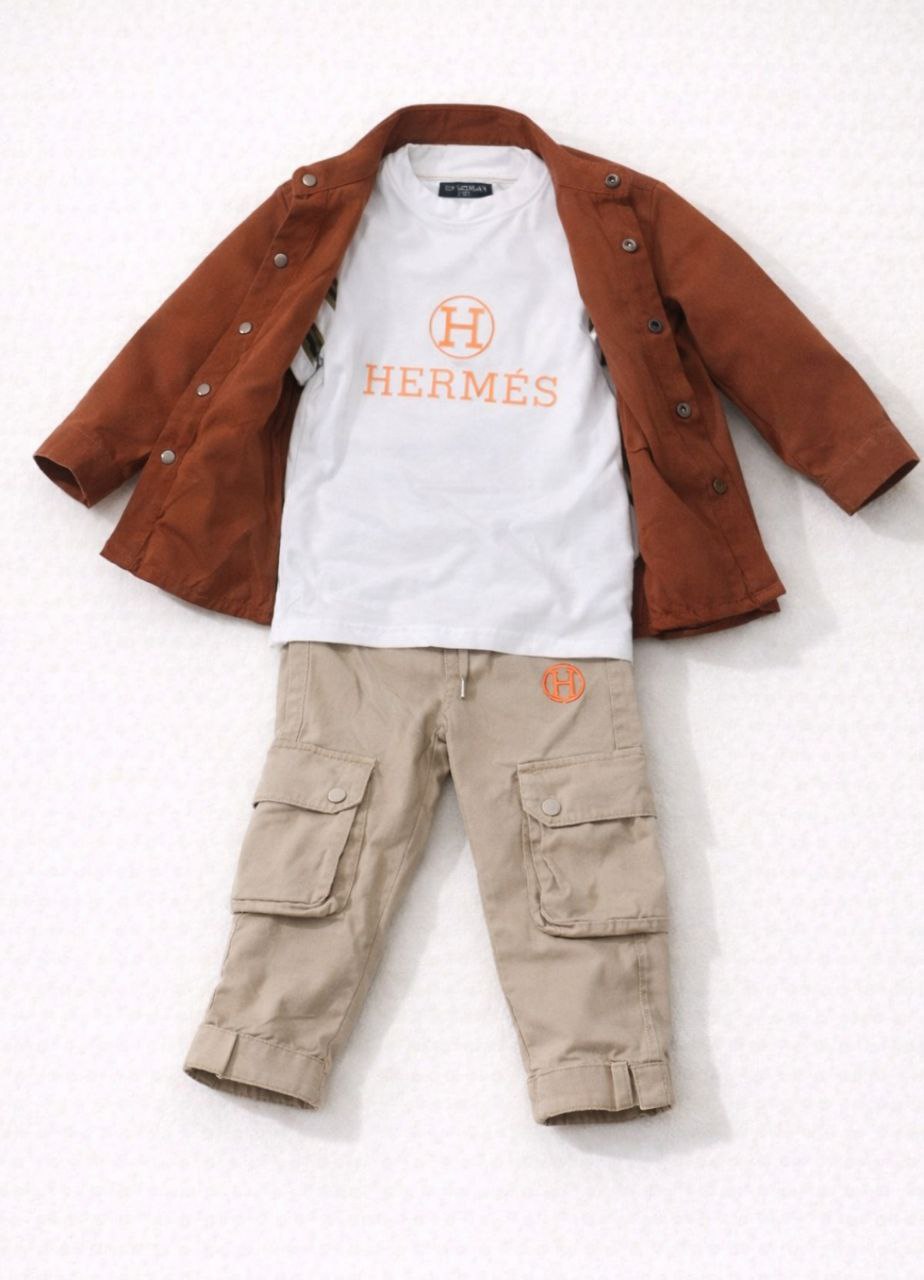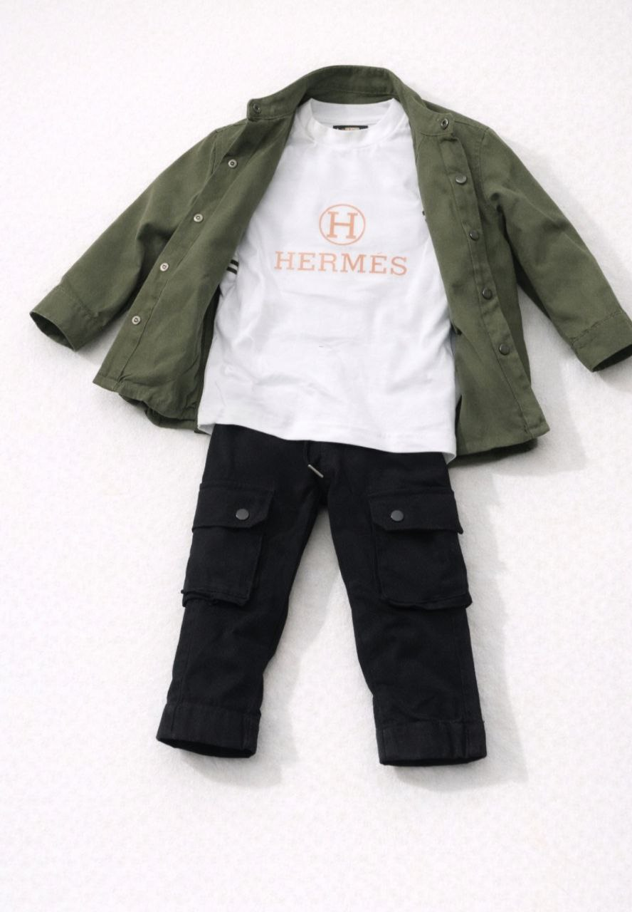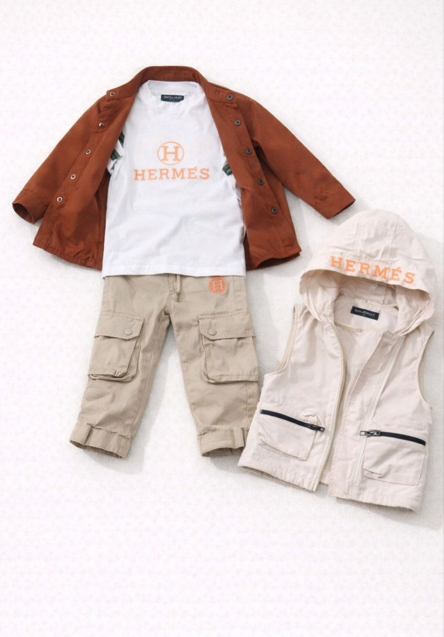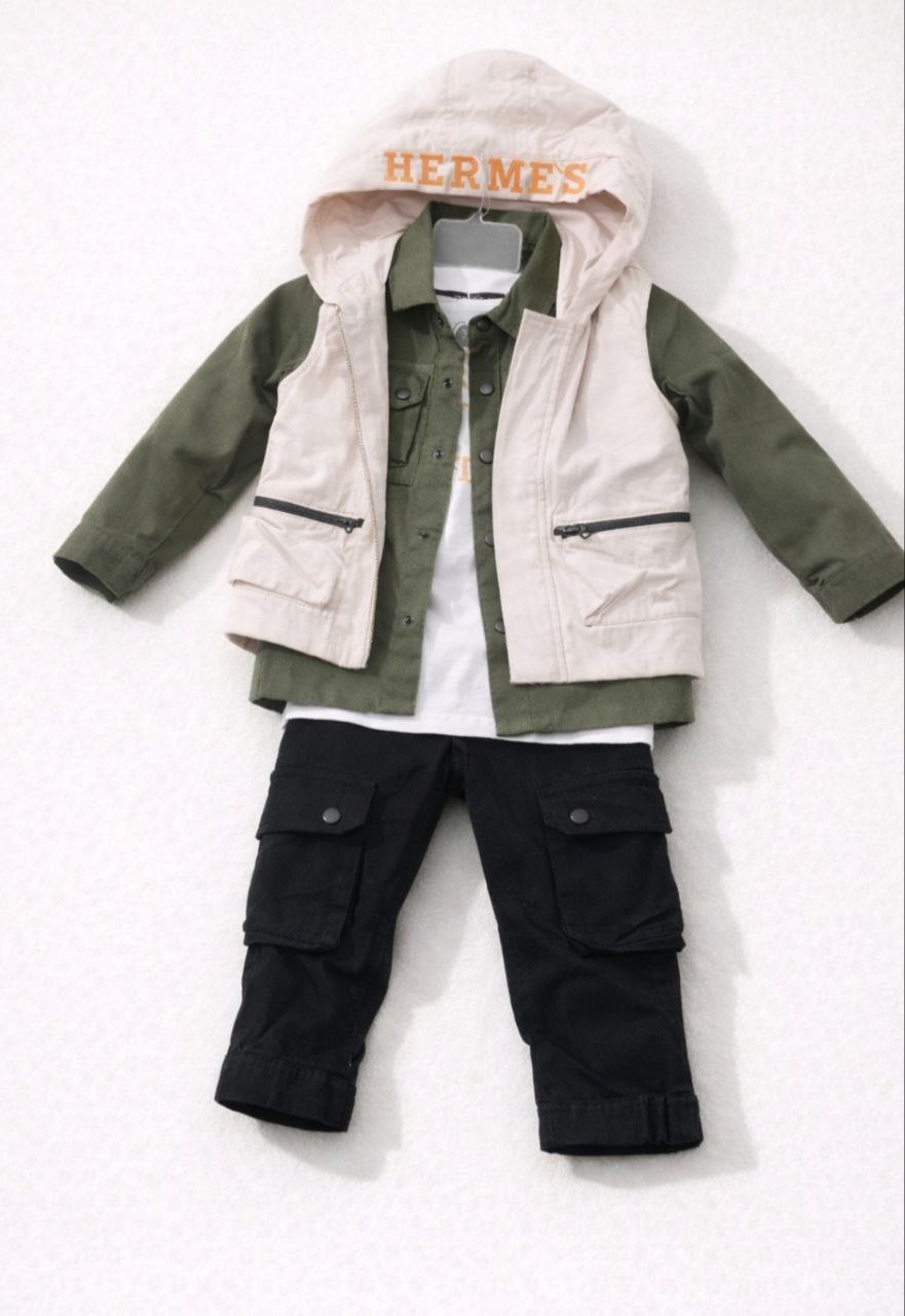 Ensemble garçon Hermès haut de gamme composé de 4 pièces : veste, chemise, pantalon cargo et gilet assorti. Style chic et moderne, parfait pour un look élégant au quotidien ou lors des occasions spéciales. Matières confortables, finitions soignées et coupe tendance. Disponible en 3 couleurs et en tailles de 2 à 5 ans.