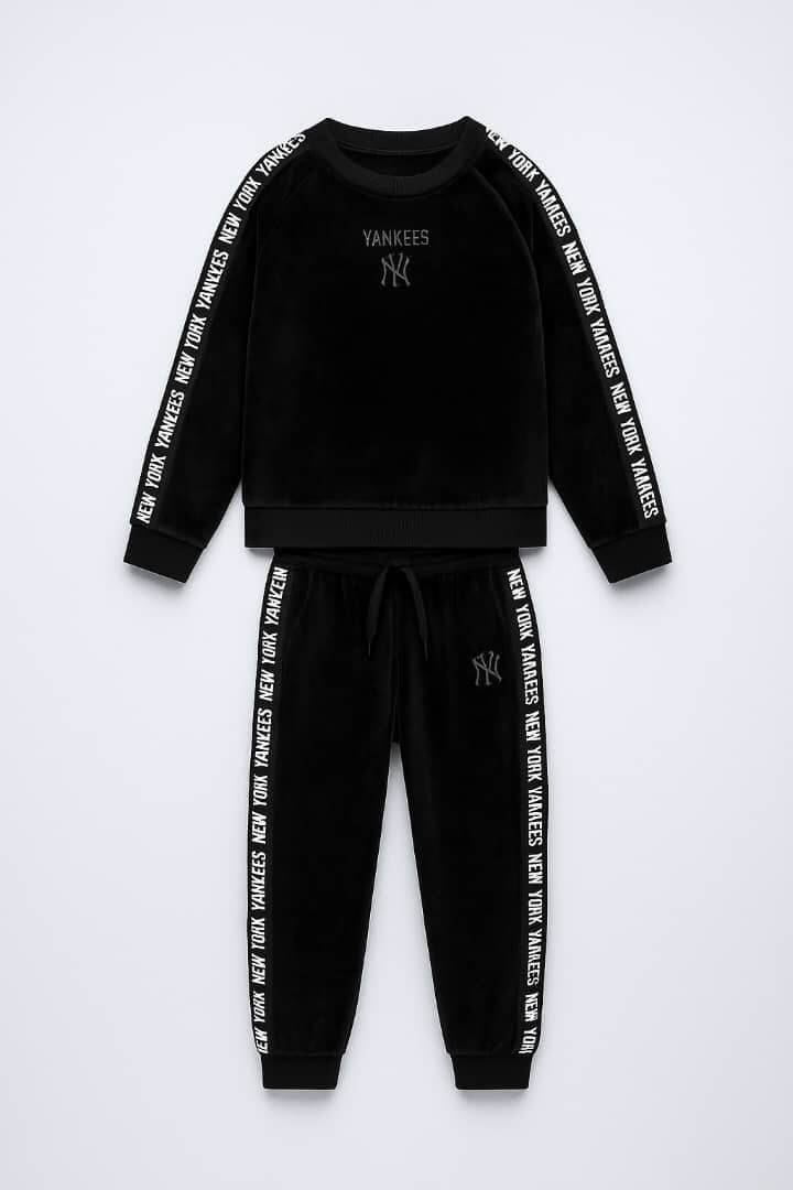 Ensemble deux pièces en velours ultra-doux, composé d’un sweat et d’un pantalon assorti avec bandes “New York Yankees”. Disponible en bleu marine et en noir, idéal pour un look sportif et tendance.