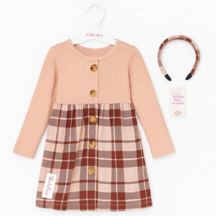 Robe fille à carreaux avec serre-tête assorti – manches longues