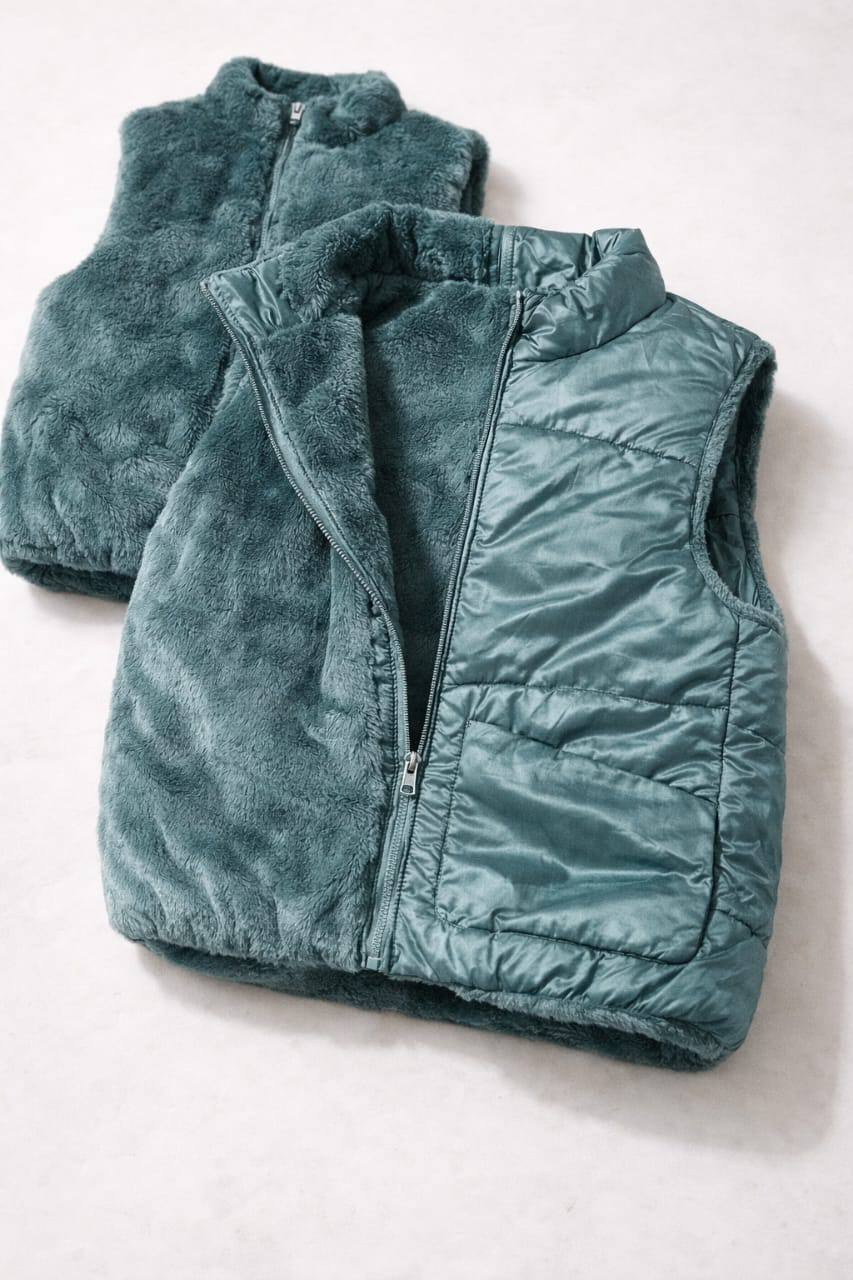 Gilet réversible pour fille, doux et chaud, avec une face peluche ultra-confortable et une face matelassée légère. Idéal pour la mi-saison et l’hiver, pratique avec sa fermeture zippée et son style moderne. Disponible du 4 au 8 ans.