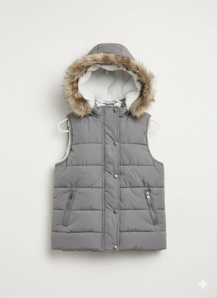 Gilet matelassé avec capuche bordée de fausse fourrure et intérieur chaud en sherpa. Disponible en deux couleurs, parfait pour un look d’hiver tendance et confortable. Convient aux filles de 7 à 14 ans.