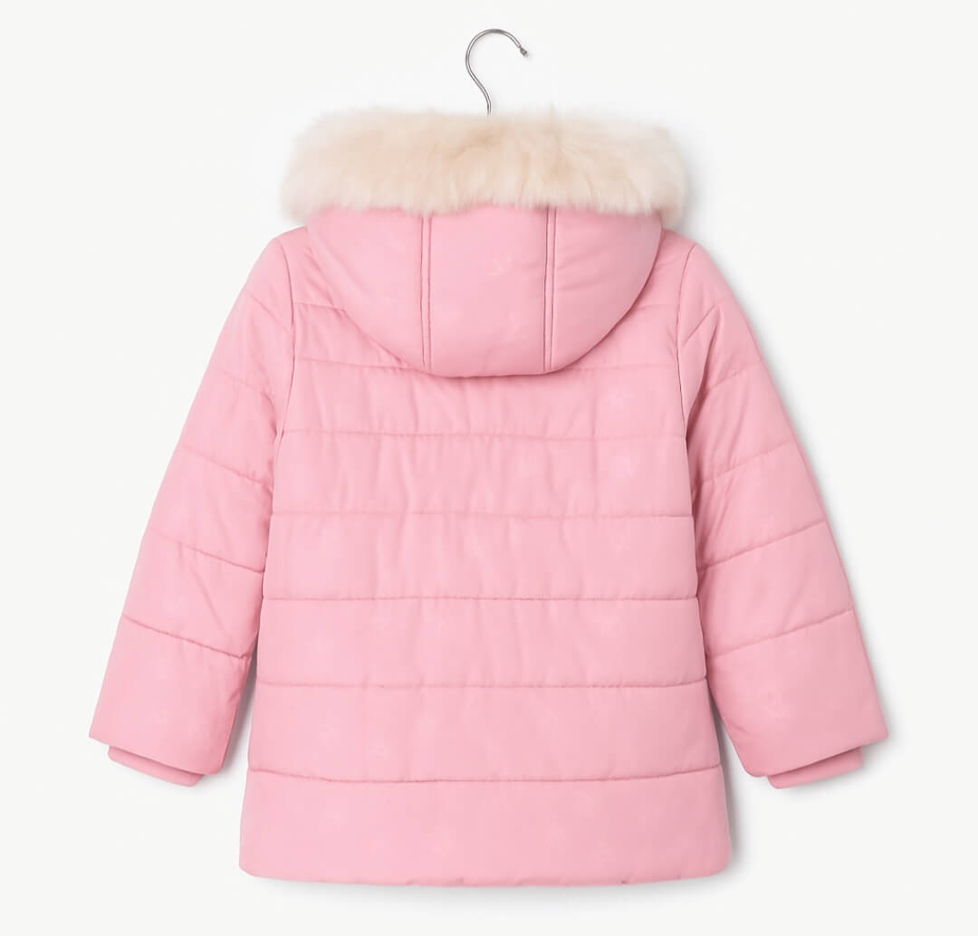 Le manteau est conçu avec un tissu résistant et un rembourrage chaud permettant de conserver la chaleur. Cette structure matelassée garantit une bonne isolation tout en restant légère. La capuche bordée de fausse fourrure ajoute une protection supplémentaire contre le vent et le froid, ce qui rend ce modèle idéal pour l’école, les promenades ou les sorties quotidiennes.