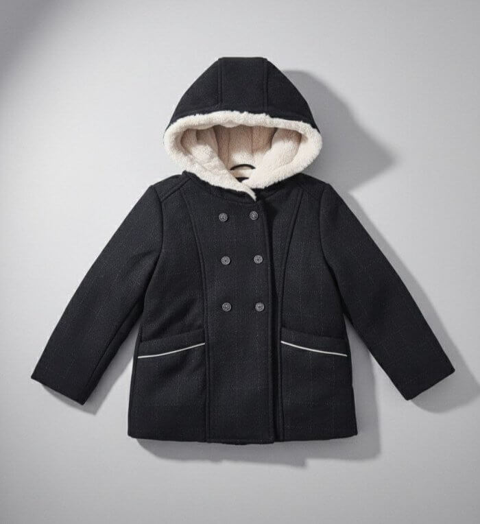 Manteau élégant pour fille, coloris noir avec capuche et doublure intérieure chaude façon sherpa. Idéal pour l’hiver : style raffiné et confort assuré ❄️🖤🧥