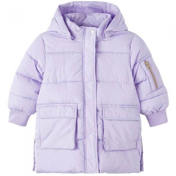 Veste fille matelassée de la marque Name It, couleur lilas très tendance, avec capuche, poches pratiques et fermeture sécurisée. Parfaite pour l’hiver grâce à son rembourrage chaud et confortable. Idéale pour l’école, les sorties et les journées froides. ✨