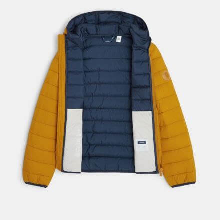 Veste garçon Okaïdi jaune moutarde avec capuche et intérieur bleu marine. Chaude, légère et idéale pour l’hiver ❄️🟡