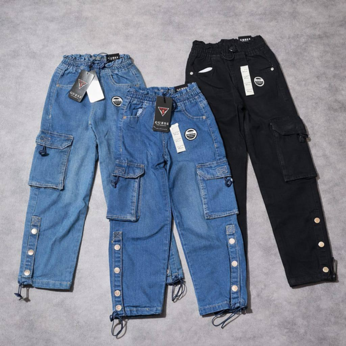 Pantalon cargo en jean pour fille de la marque Guess, au design tendance et moderne avec poches cargo fonctionnelles et taille élastique pour un confort optimal. Modèle pratique et stylé, idéal pour un look casual chic au quotidien. Disponible en 3 couleurs, pour filles de 4 à 14 ans.