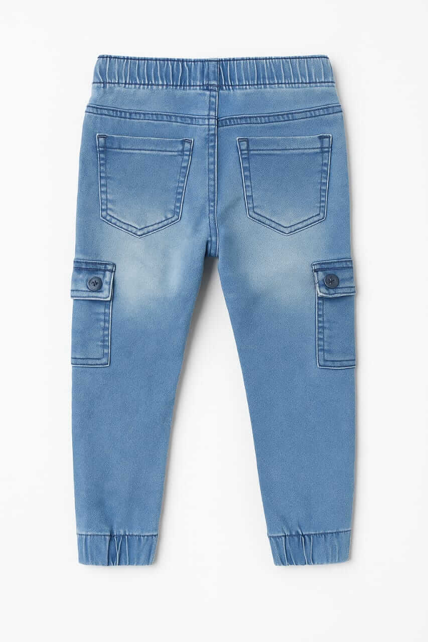 Pantalon cargo garçon en jean bleu, taille élastique avec cordon et poches latérales pratiques. Style tendance et confortable.