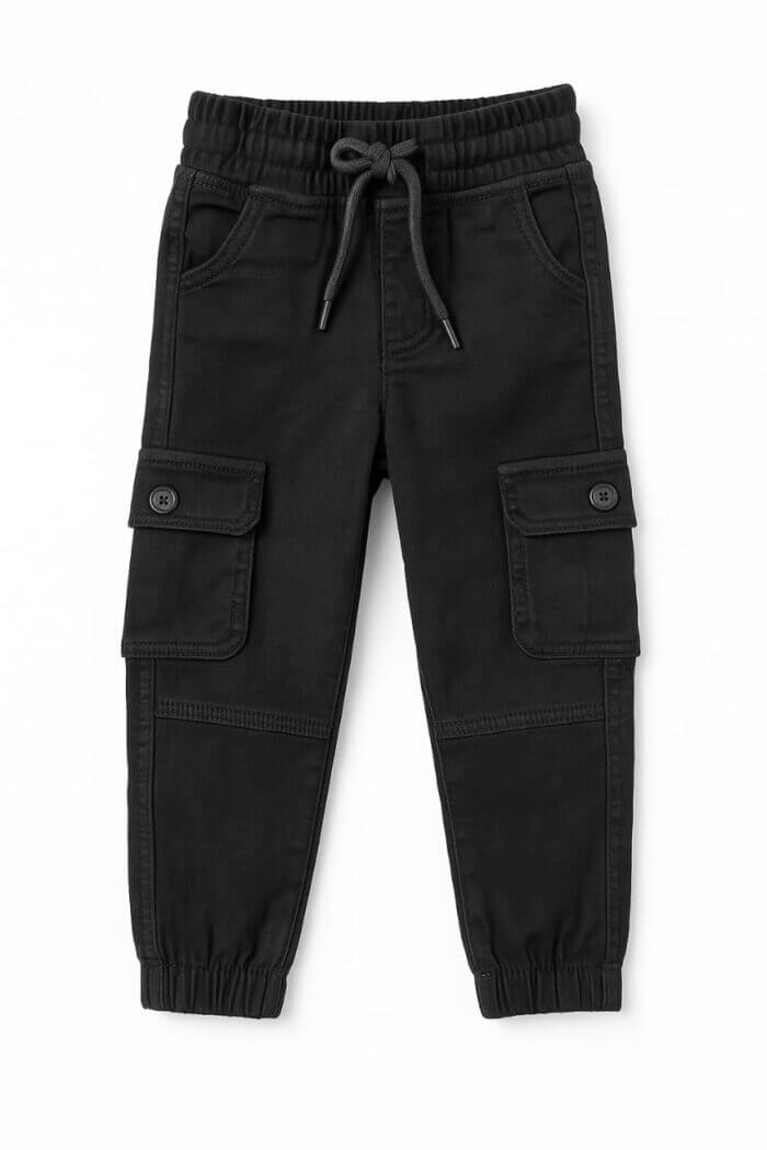Pantalon cargo garçon noir avec cordon, taille élastique et poches cargo pratiques. Confortable, solide et moderne pour un style polyvalent.
