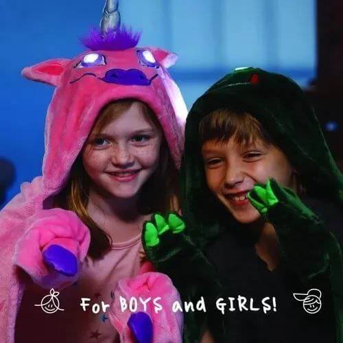 Grâce à sa capuche amusante, l’enfant peut se transformer en créature adorable. La licorne rose possède une corne scintillante et des yeux LED lumineux. Le dinosaure vert, quant à lui, affiche un look amusant et rassurant. Ainsi, chaque modèle rend l’expérience encore plus ludique.