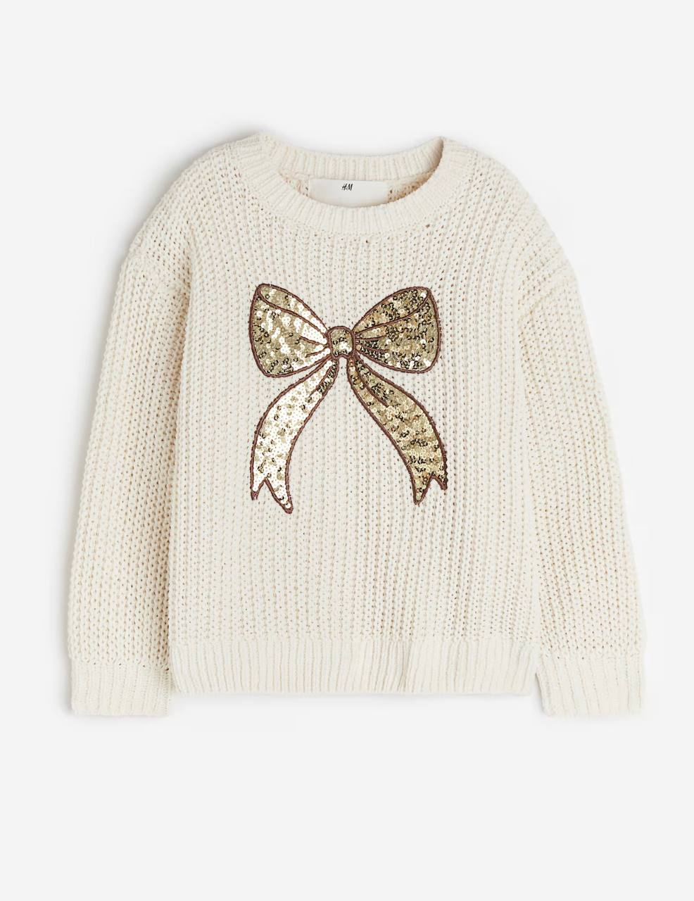 Pull pour fille de la marque H&M, en maille douce et confortable avec grand nœud pailleté décoratif sur le devant. Design élégant et chaleureux, idéal pour l’hiver et les sorties. Disponible pour filles de 1 à 10 ans
