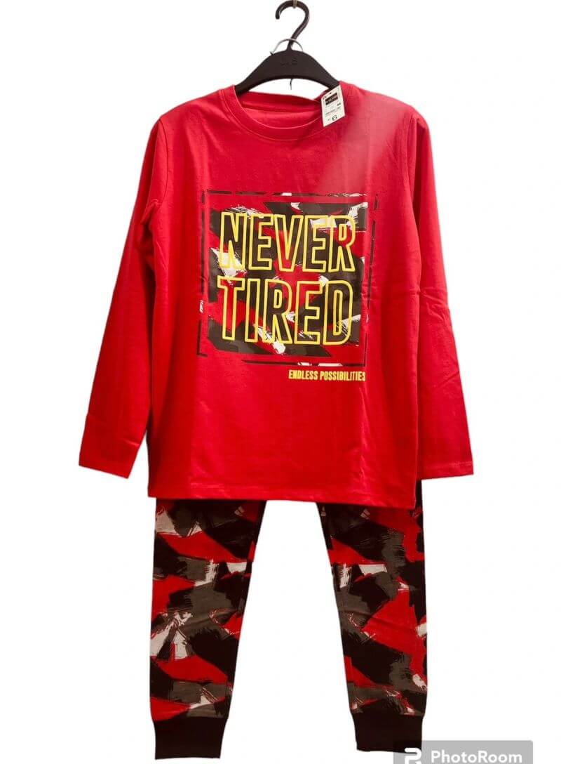 Les pyjamas garçons se déclinent en coloris dynamiques : bleu avec le motif “GOAL!” ⚽️ et rouge avec l’imprimé “NEVER TIRED” 💪, parfaits pour les jeunes champions pleins d’énergie.