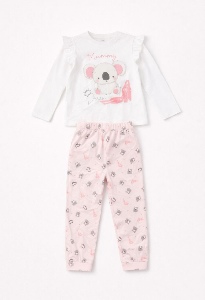 Pyjama fille deux pièces de la marque Weekend Essentials, composé d’un haut blanc à manches longues avec imprimé koala et d’un pantalon rose imprimé. Doux, confortable et idéal pour le quotidien et le sommeil.