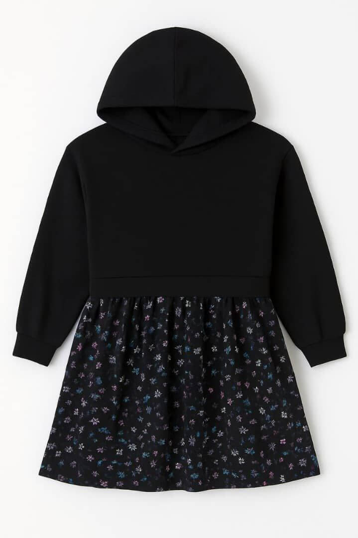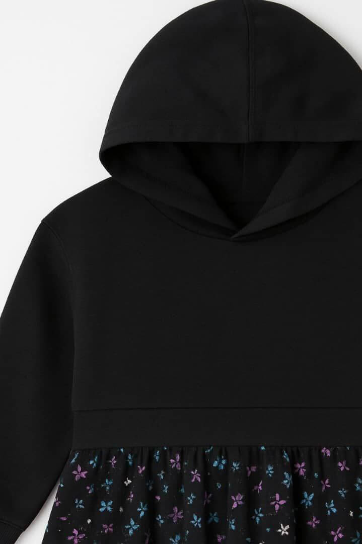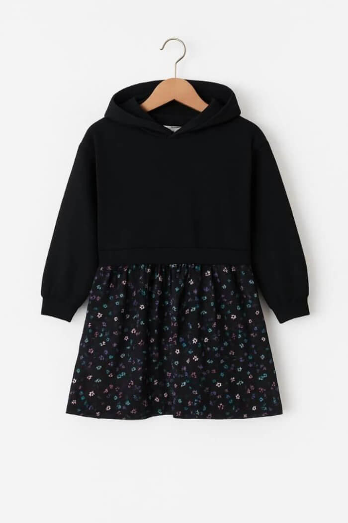Robe tendance avec haut style sweat à capuche et jupe à motif fleuri. Confortable et idéale pour un look casual chic. Convient aux filles de 7 à 13 ans.