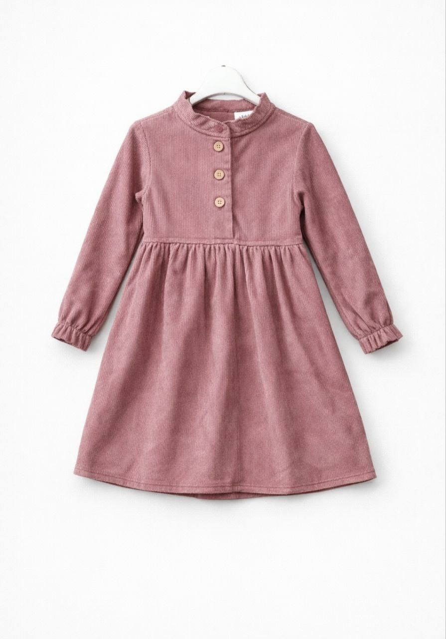 Robe élégante pour fille en velours côtelé doux, signée Mirage, marque algérienne locale. Coupe confortable avec manches longues et boutons décoratifs, idéale pour l’automne et l’hiver. Disponible en 6 couleurs, de 2 à 10 ans.