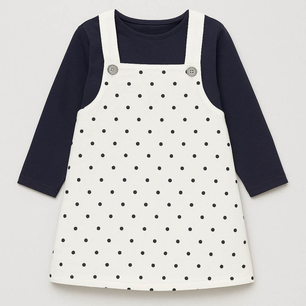 Cet ensemble se compose d’une robe blanche à pois noirs et d’un t-shirt bleu marine à manches longues. Grâce à sa coupe évasée, la robe met en valeur un style doux et intemporel. De plus, les bretelles boutonnées facilitent l’habillage, ce qui le rend pratique au quotidien.