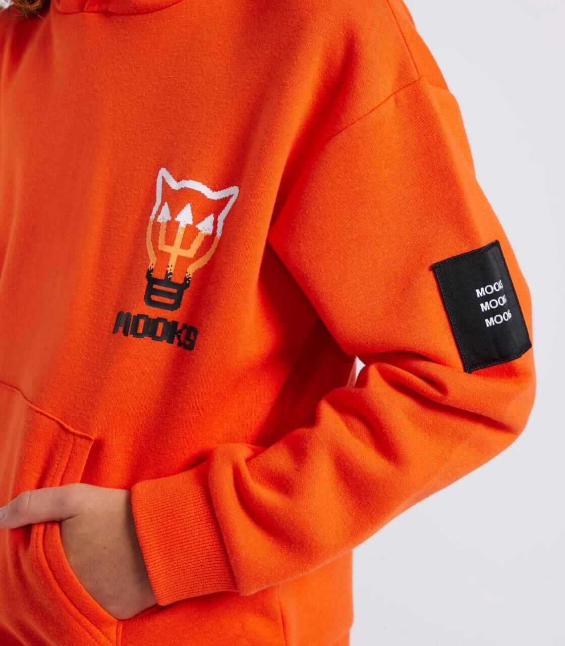 Sweat à capuche enfant Mooks en coton orange vif, logo renard graphique, poche kangourou et patch sur la manche. Confortable, stylé et unisexe.