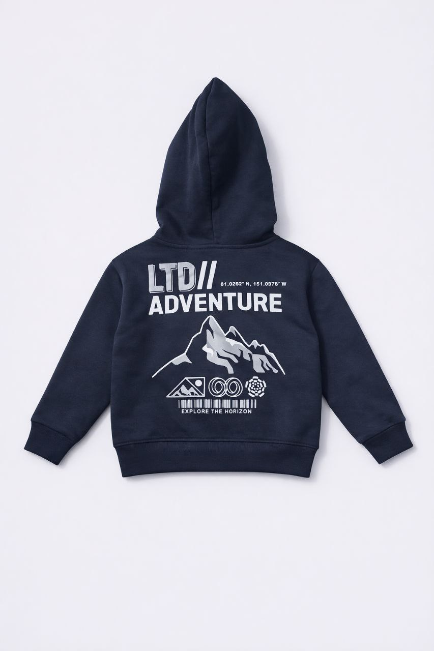 Sweat à capuche pour garçon de la marque LTD Kids, de couleur bleu marine, avec imprimé “Adventure” au dos et sur le devant. Confortable et chaud, doté d’une poche kangourou et d’une demi-fermeture zippée, idéal pour un style casual et pratique au quotidien. Disponible de 2 à 10 ans.