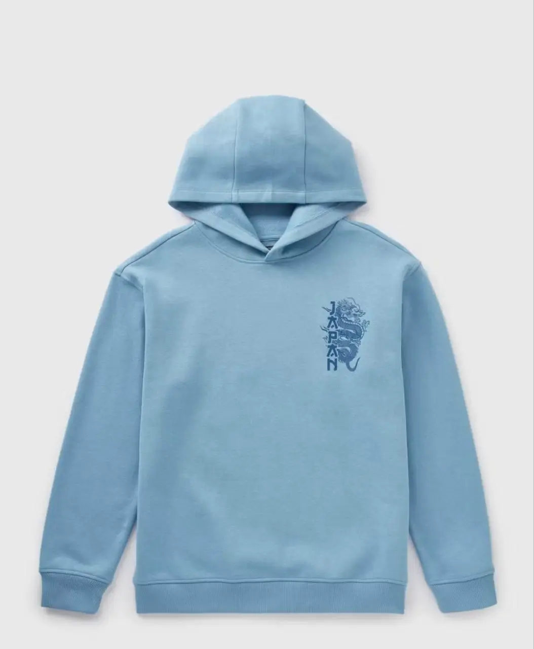 Sweat à capuche pour garçon de la marque Matalan, au coloris bleu clair avec imprimé discret « Japan » et motif dragon sur la poitrine. Confortable et chaud, avec finitions côtelées, idéal pour un look moderne et décontracté au quotidien.