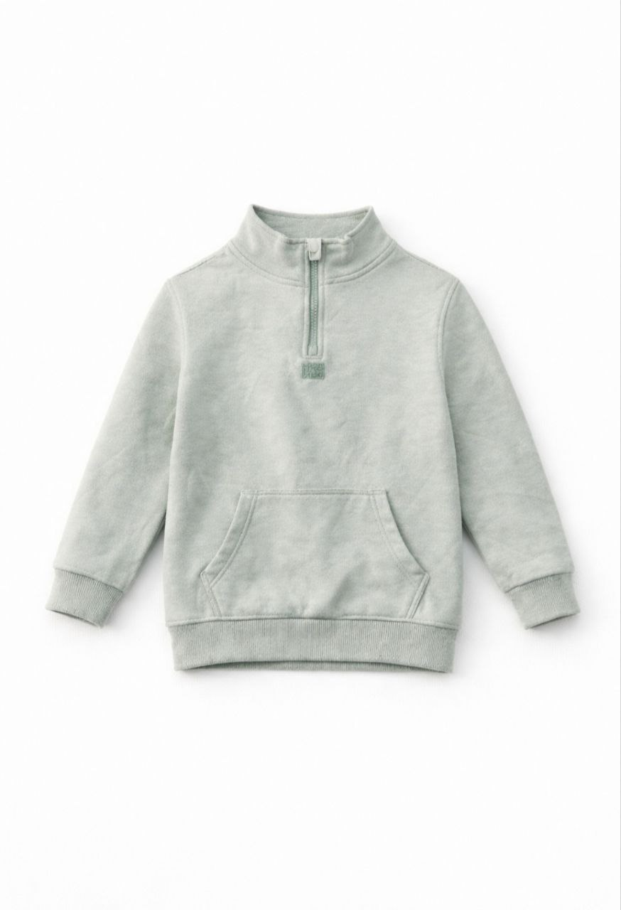 Sweat pour enfant de la marque Mac + Ellie, avec col montant zippé et poche kangourou. Confortable et pratique pour le quotidien, disponible en deux couleurs : vert clair et noir. Convient aux enfants de 4 à 8 ans.