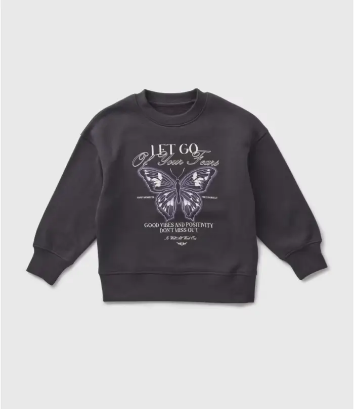 Sweat fille de la marque Matalan, au coloris noir avec imprimé papillon et message inspirant. Coupe confortable avec finitions côtelées, idéal pour un look tendance et cosy au quotidien. Parfait à porter avec un jean ou un legging pour la mi-saison et l’hiver.