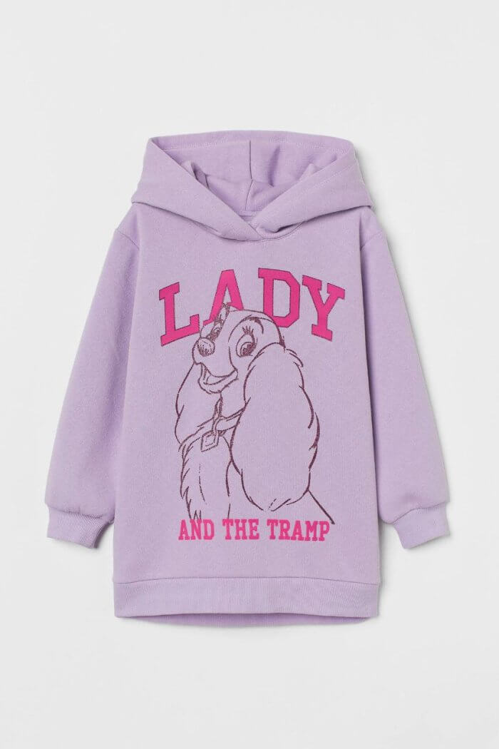 Sweat fille H&M couleur violet avec capuche et imprimΓ© Lady and the Tramp. Doux, confortable et parfait pour un look Disney tendance πŸ’œπŸΎ