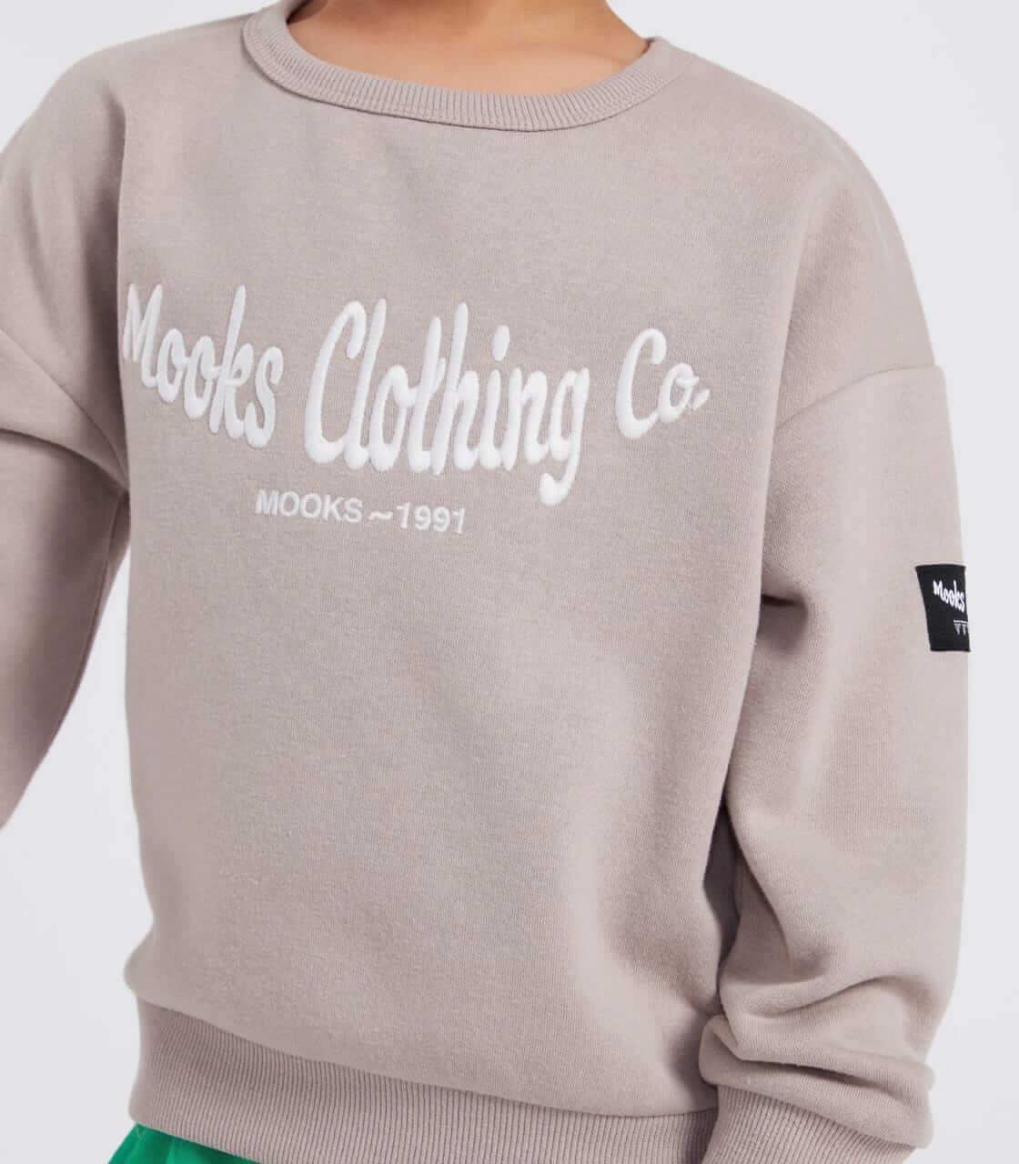 Sweat-shirt garçon Mooks Clothing Co. en coton doux beige, coupe décontractée avec logo brodé et détails soignés. Confortable, tendance et facile à assortir.