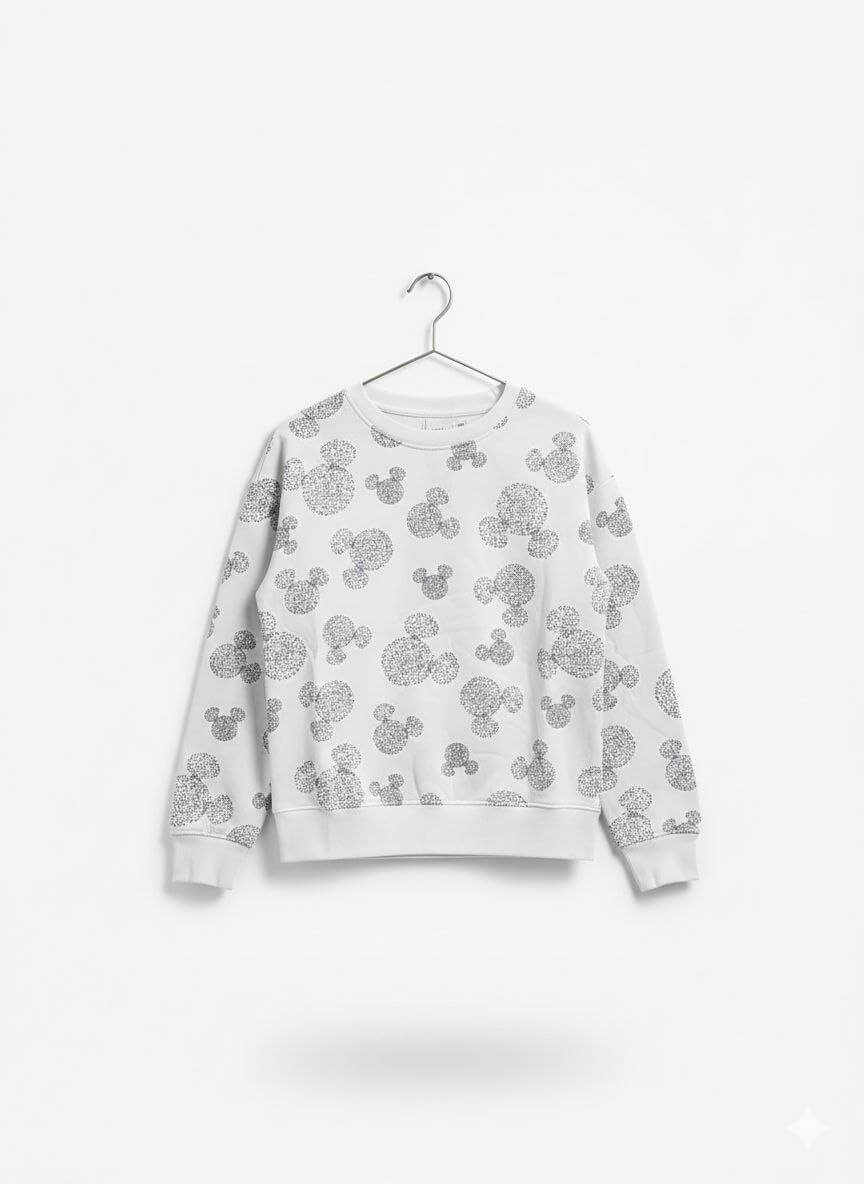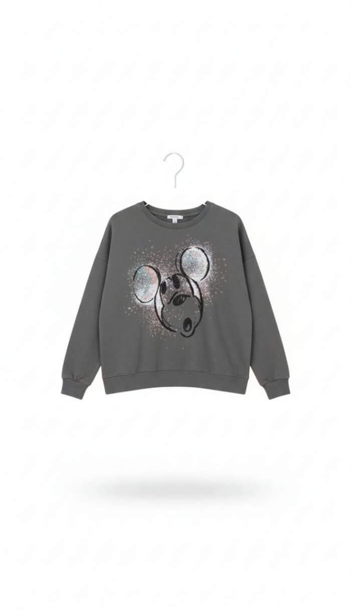 Sweatshirt féminin disponible en 3 modèles tendance : uni avec détails jaunes, imprimé Mickey glitter, ou motif Mickey brillant sur fond gris. Coupe confortable, toucher doux et finition soignée.
