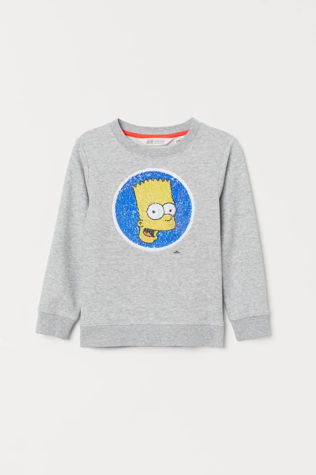 Sweatshirt garçon Bart Simpson gris avec sequins réversibles, disponible du 1,5 an au 12 ans.