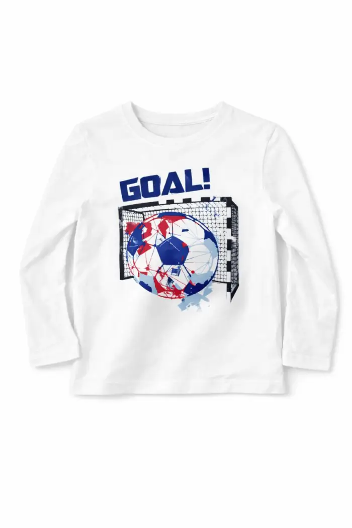T-shirt garçon à manches longues de la marque Primark, au coloris blanc avec imprimé football dynamique « GOAL », idéal pour les petits fans de sport. Conçu dans une matière douce et confortable, parfait pour le quotidien, la crèche ou les sorties. Facile à associer avec un jean ou un pantalon de sport. Disponible pour les garçons de 2 à 5 ans.