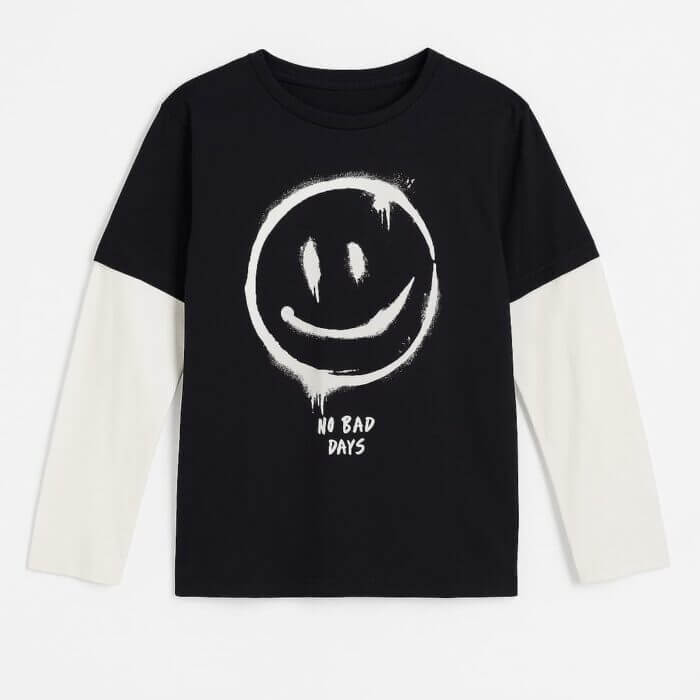 T-shirt garçon manches longues, dispo en 3 modèles : bleu imprimé, noir smiley & bicolore. Confortable, stylé et idéal au quotidien