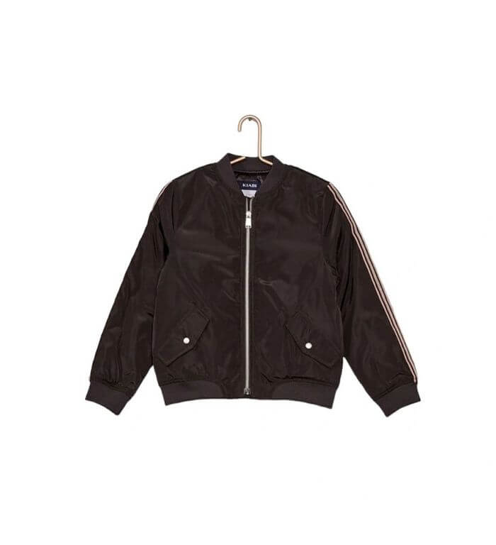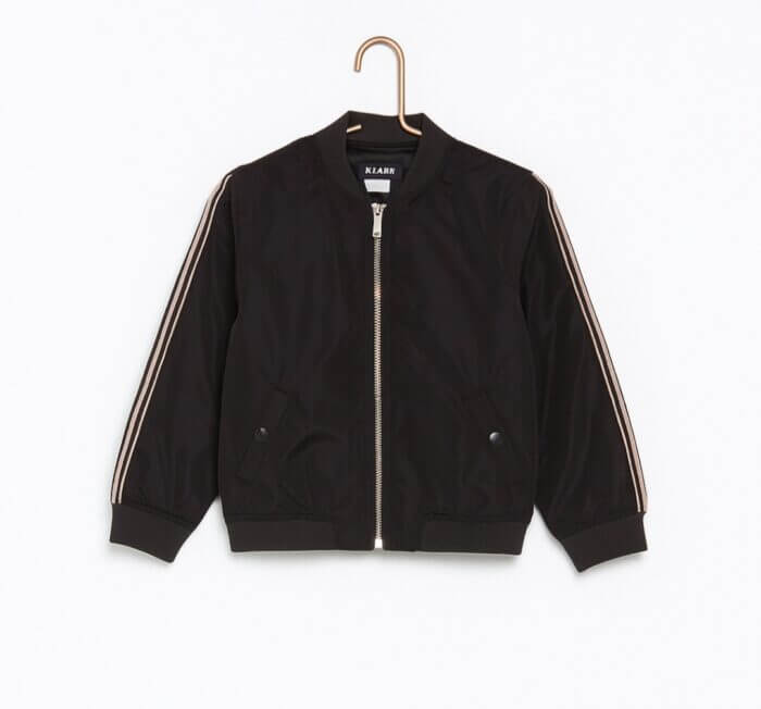 Veste bomber fille Kiabi noire avec bandes rayées. Confortable et tendance. Disponible du 3 au 12 ans. Parfaite pour l’école et les sorties 🌟