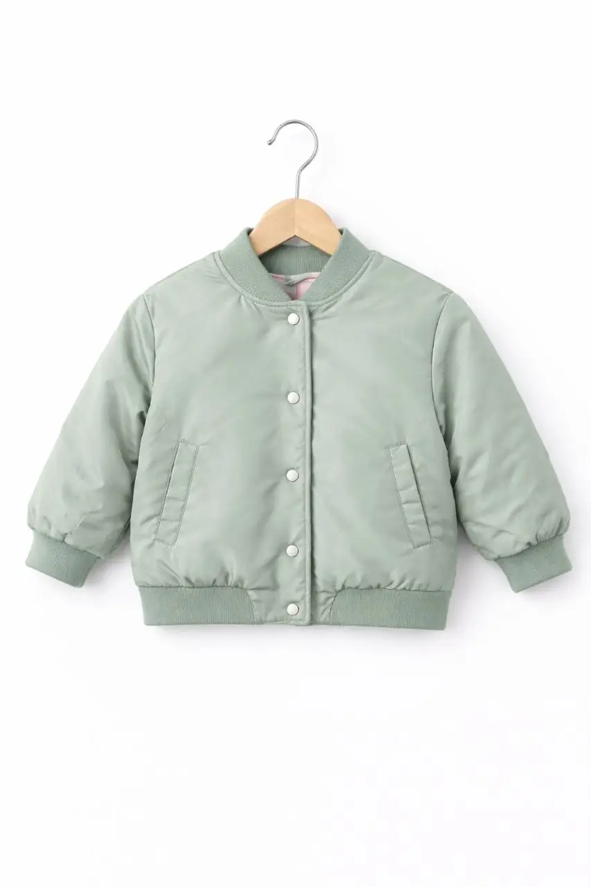 Veste bomber pour fille de la marque Matalan, au coloris vert doux, avec fermeture à boutons-pression, poignets et base côtelés. Chaude et confortable, idéale pour la mi-saison et l’hiver léger. Disponible du 2 au 7 ans.