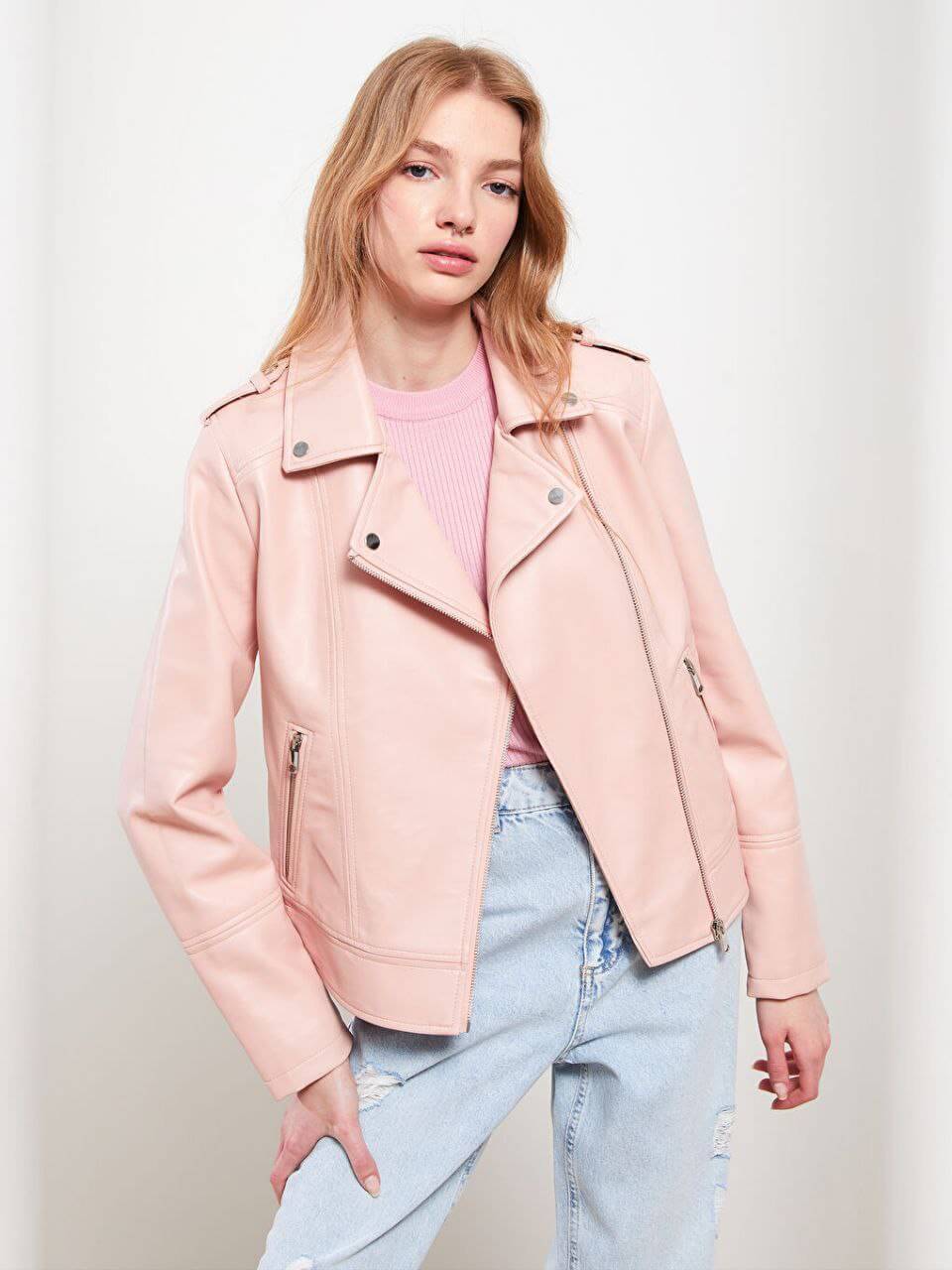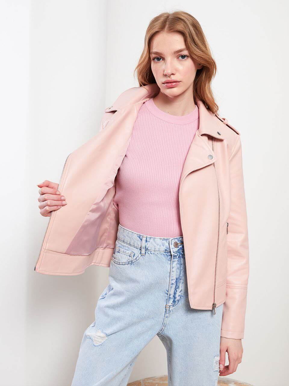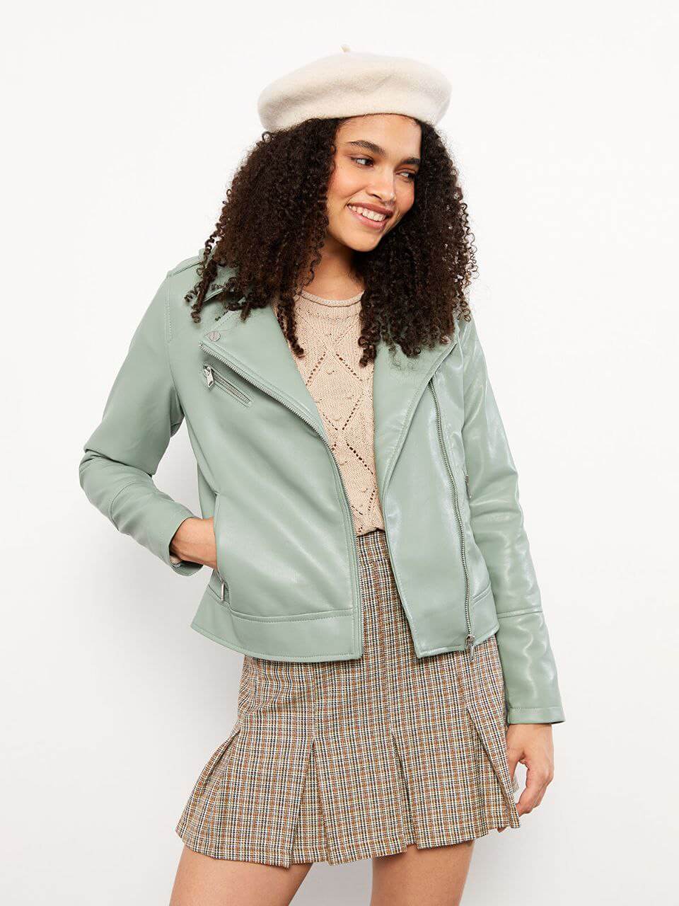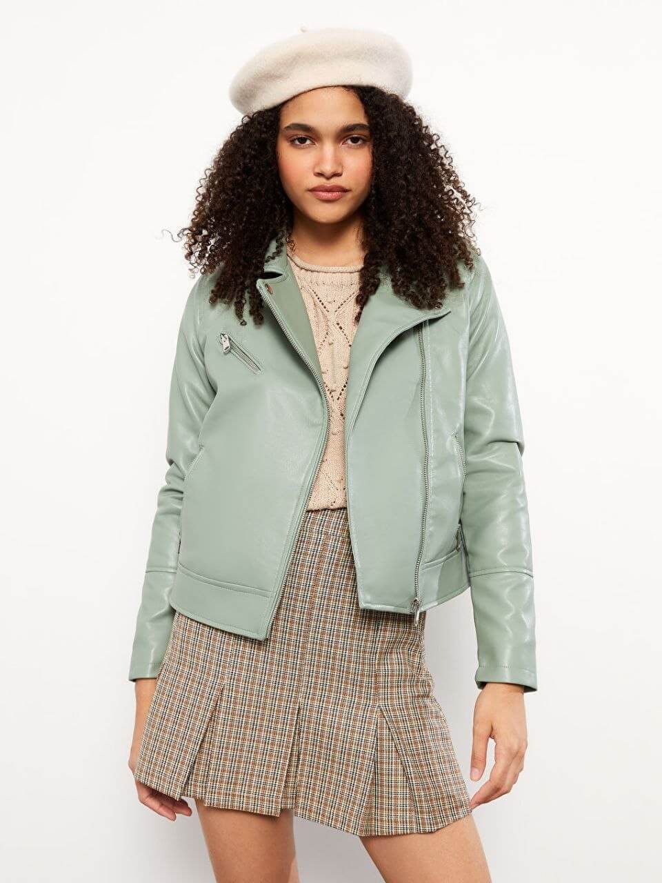 Veste féminine en simili cuir, coupe moderne avec fermeture asymétrique et détails zippés. Disponible en 3 couleurs élégantes : noir, rose et vert.