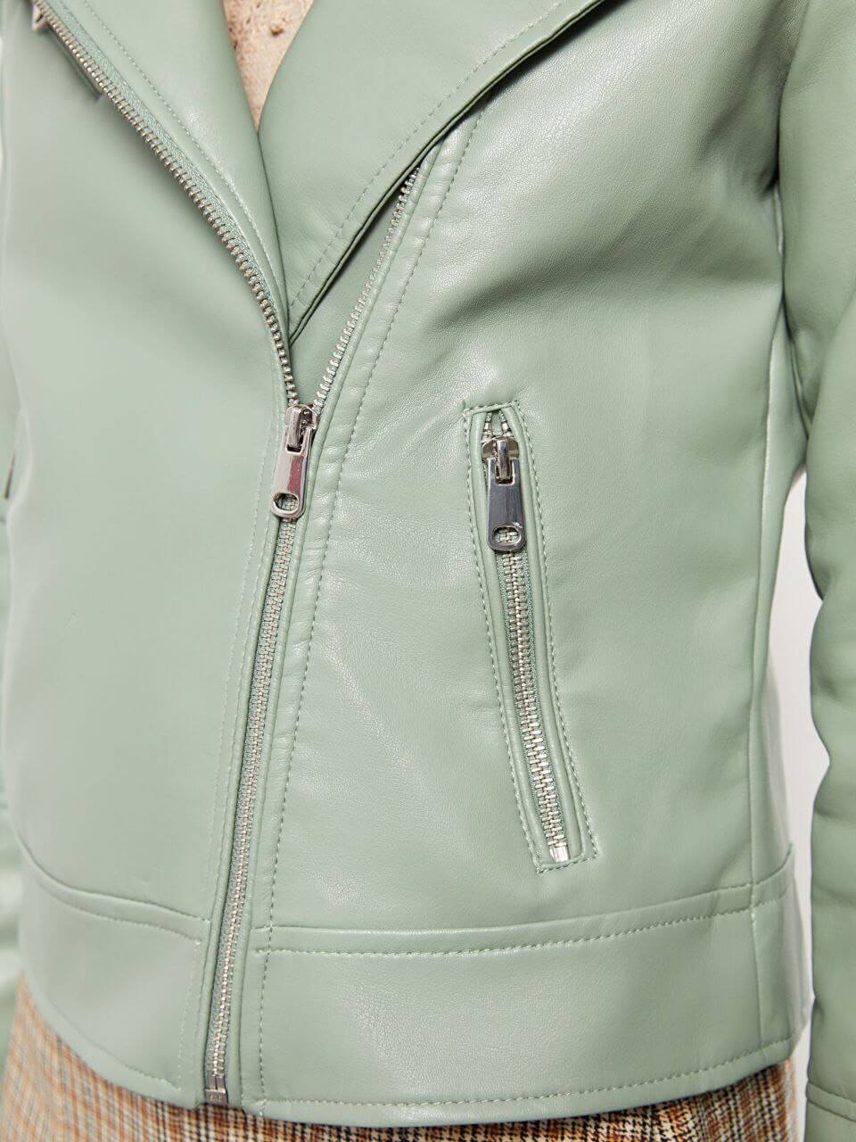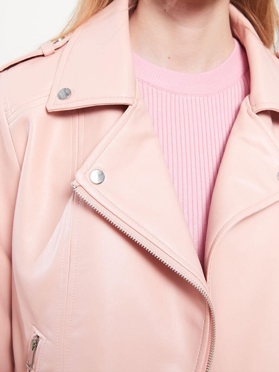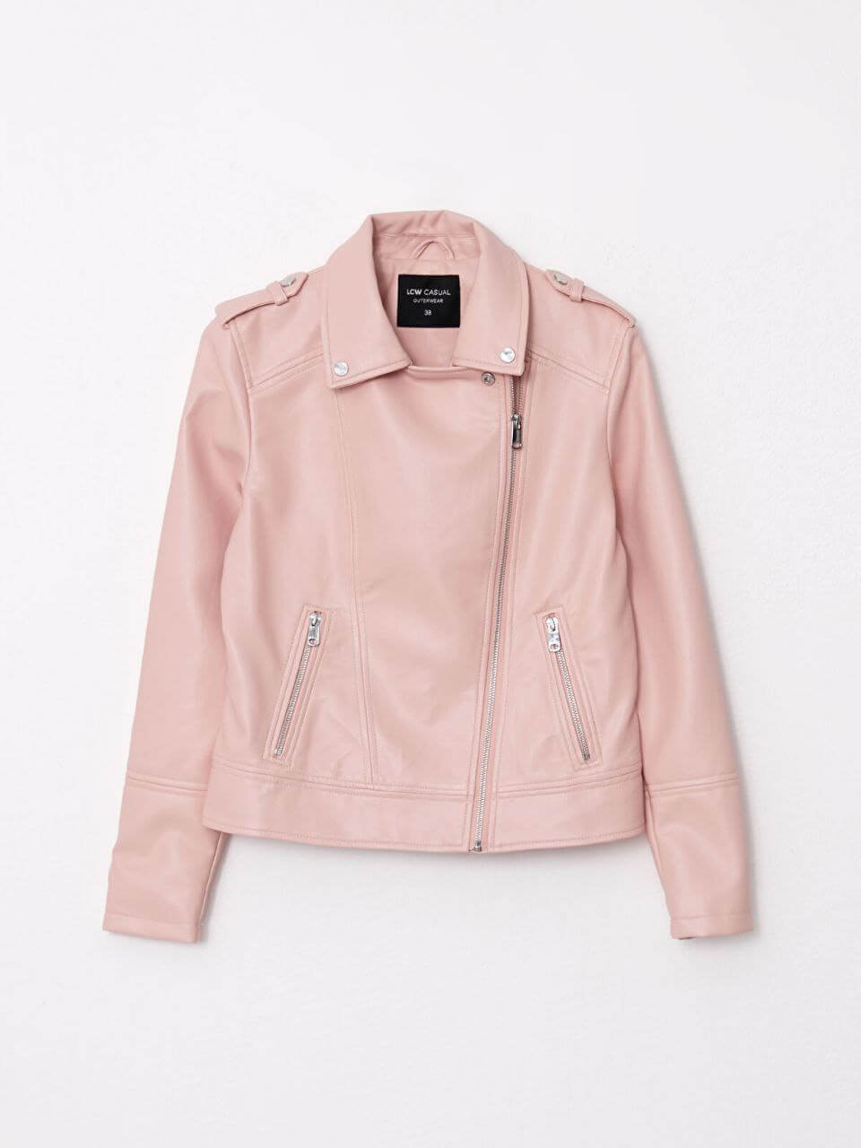Veste féminine en simili cuir, coupe moderne avec fermeture asymétrique et détails zippés. Disponible en 3 couleurs élégantes : noir, rose et vert.
