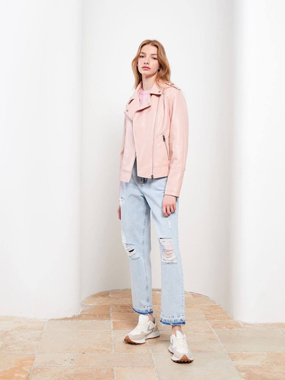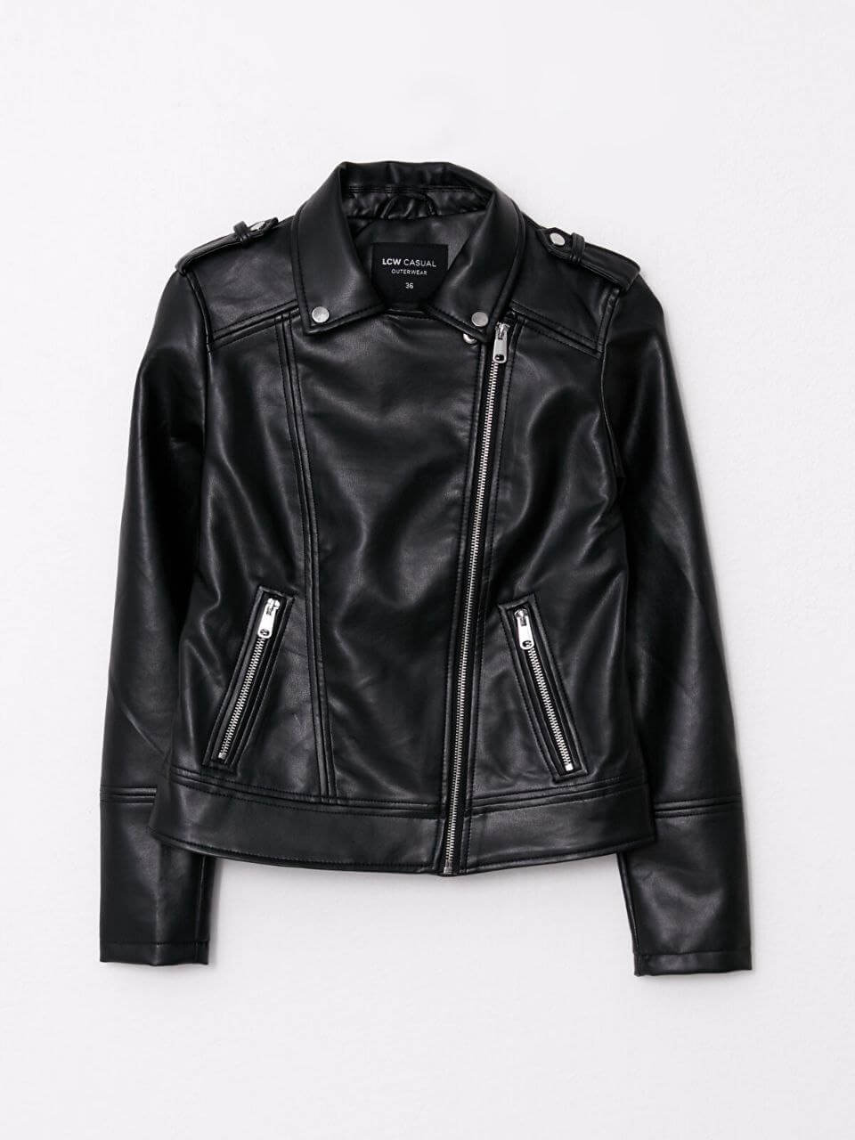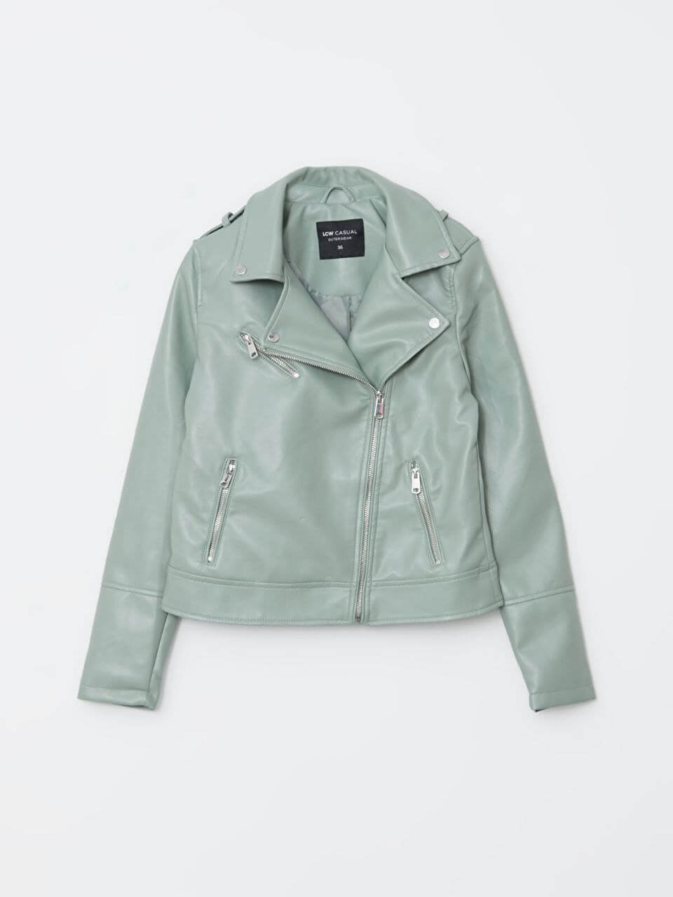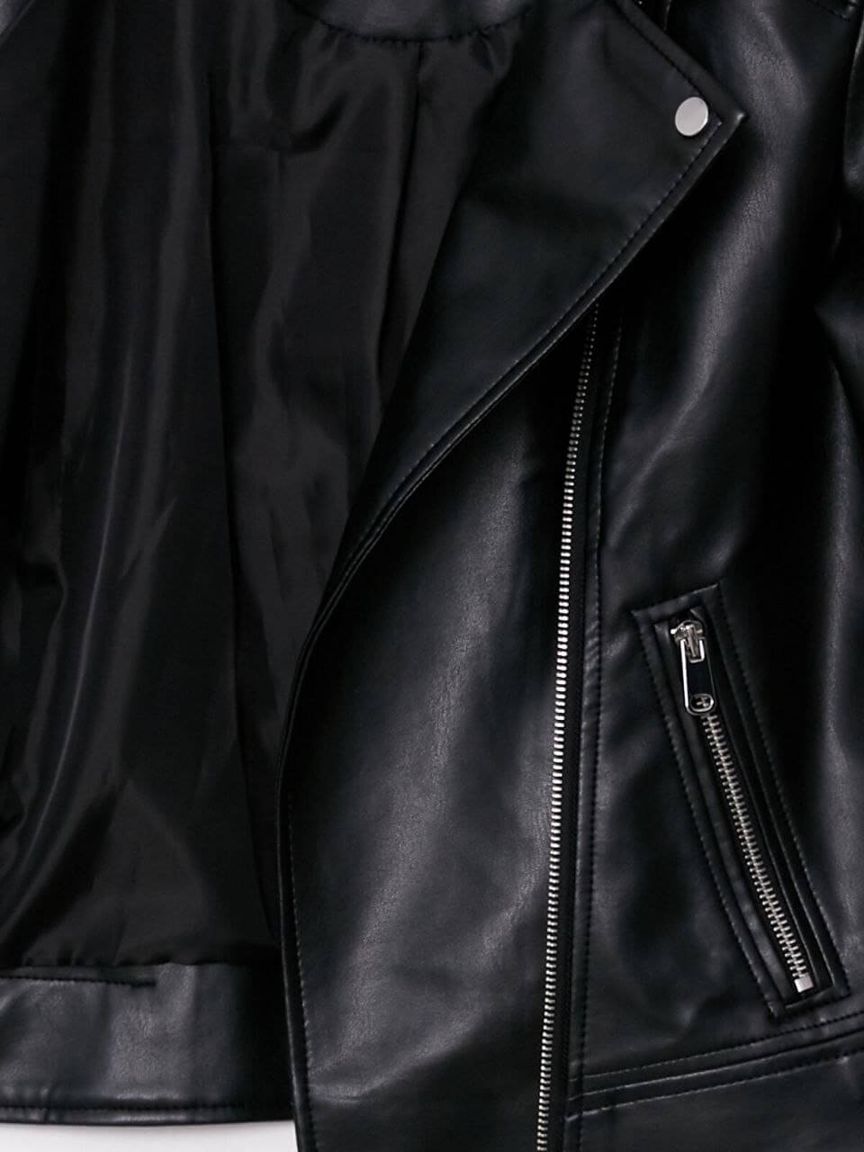 Veste féminine en simili cuir, coupe moderne avec fermeture asymétrique et détails zippés. Disponible en 3 couleurs élégantes : noir, rose et vert.