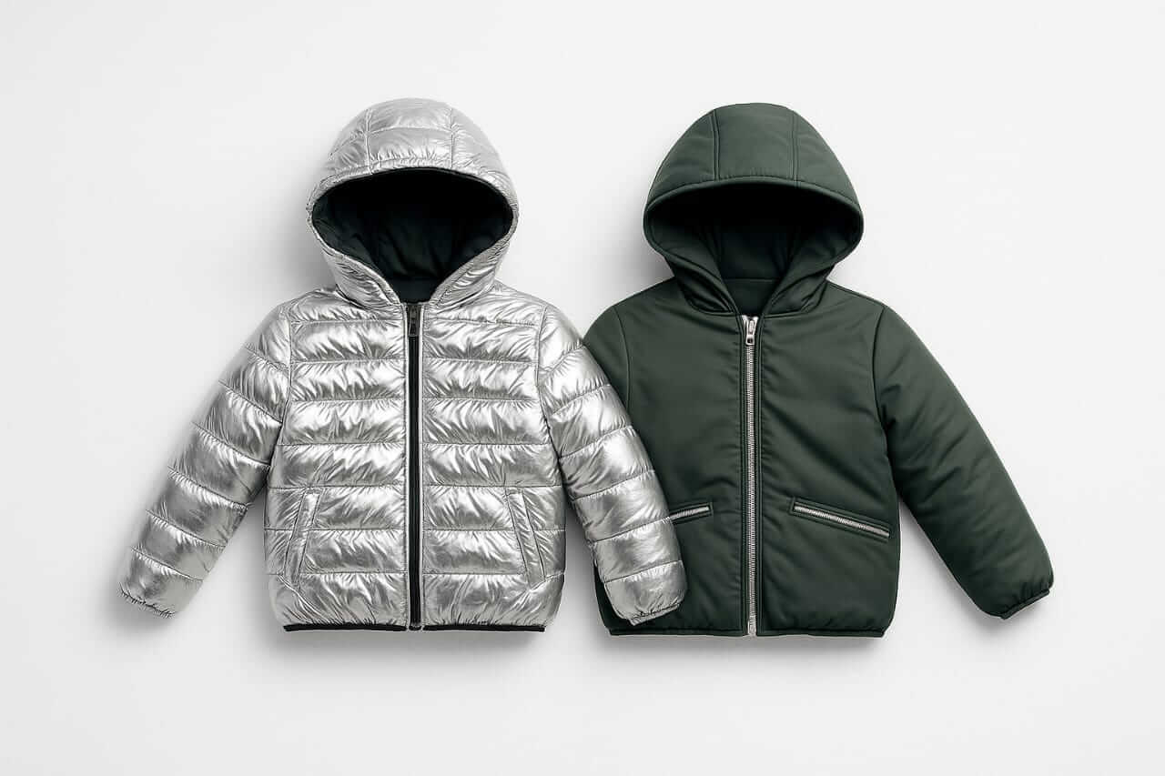 La veste garçon double face est une pièce pratique, moderne et très confortable. Elle offre deux styles dans un seul vêtement. De plus, elle est légère et chaude, ce qui la rend idéale pour la saison froide. Cette veste existe en deux modèles différents. Le premier combine un côté bleu nuit et un côté jaune vif. Le second mélange un côté vert foncé et un côté argenté métallisé. Ainsi, chaque enfant peut changer de look quand il le souhaite.