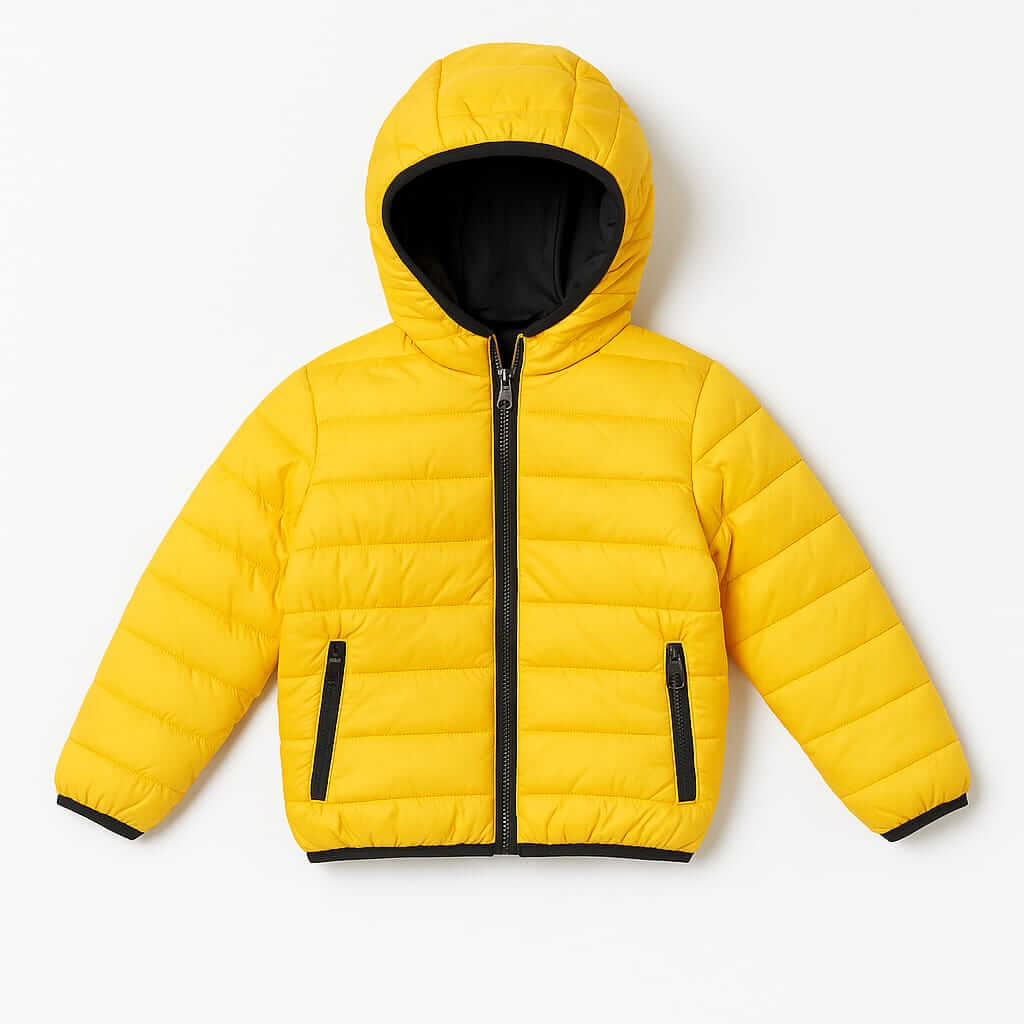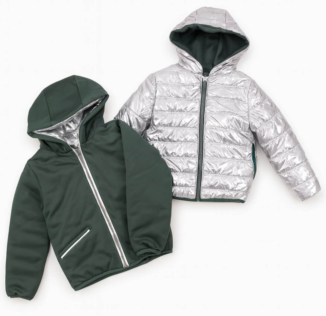 Veste garçon double face, chaude, légère et pratique. Disponible en deux modèles : bleu nuit avec intérieur jaune, et vert foncé avec côté argenté. Idéale pour l’hiver et parfaite de 3 à 14 ans.