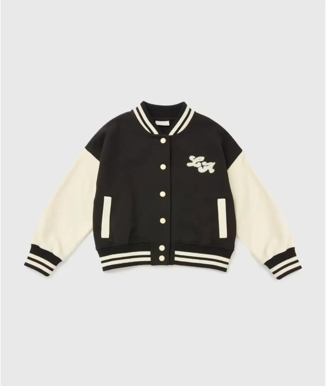 Veste garçon de la marque Matalan au design varsity moderne, avec corps noir et manches écru contrastées. Fermeture à boutons-pression, finitions côtelées rayées et poches latérales pour un look sportif et tendance. Idéale pour la mi-saison et les tenues casual du quotidien.
