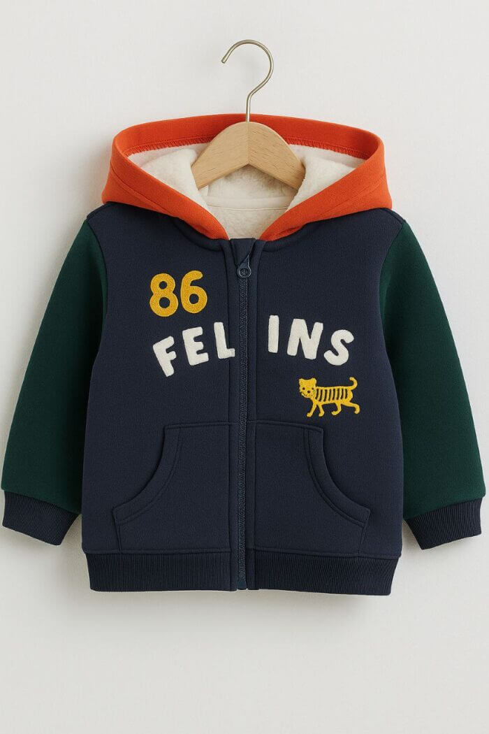 Sa capuche doublĂ©e en orange vif apporte un contraste colorĂ©, tandis que les manches vert foncĂ© et le corps bleu marine donnent un look urbain et moderne. La fermeture zippĂ©e facilite l’habillage quotidien, et les deux grandes poches Ă  l’avant sont parfaites pour y glisser les mains ou ranger des petits objets. Sur la poitrine, le mot “FELINS” accompagnĂ© d’un petit tigre jaune ajoute une touche fun et originale qui sĂ©duira les enfants.