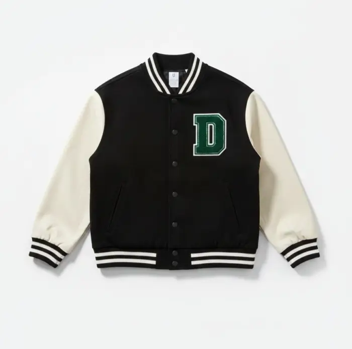 Veste teddy pour garçon au style varsity, en coloris noir avec manches beige et patch lettre « D » brodé. Chaude et confortable, dotée de boutons-pression et de finitions côtelées, idéale pour l’école et les sorties quotidiennes. Disponible du 4 au 15-16 ans.